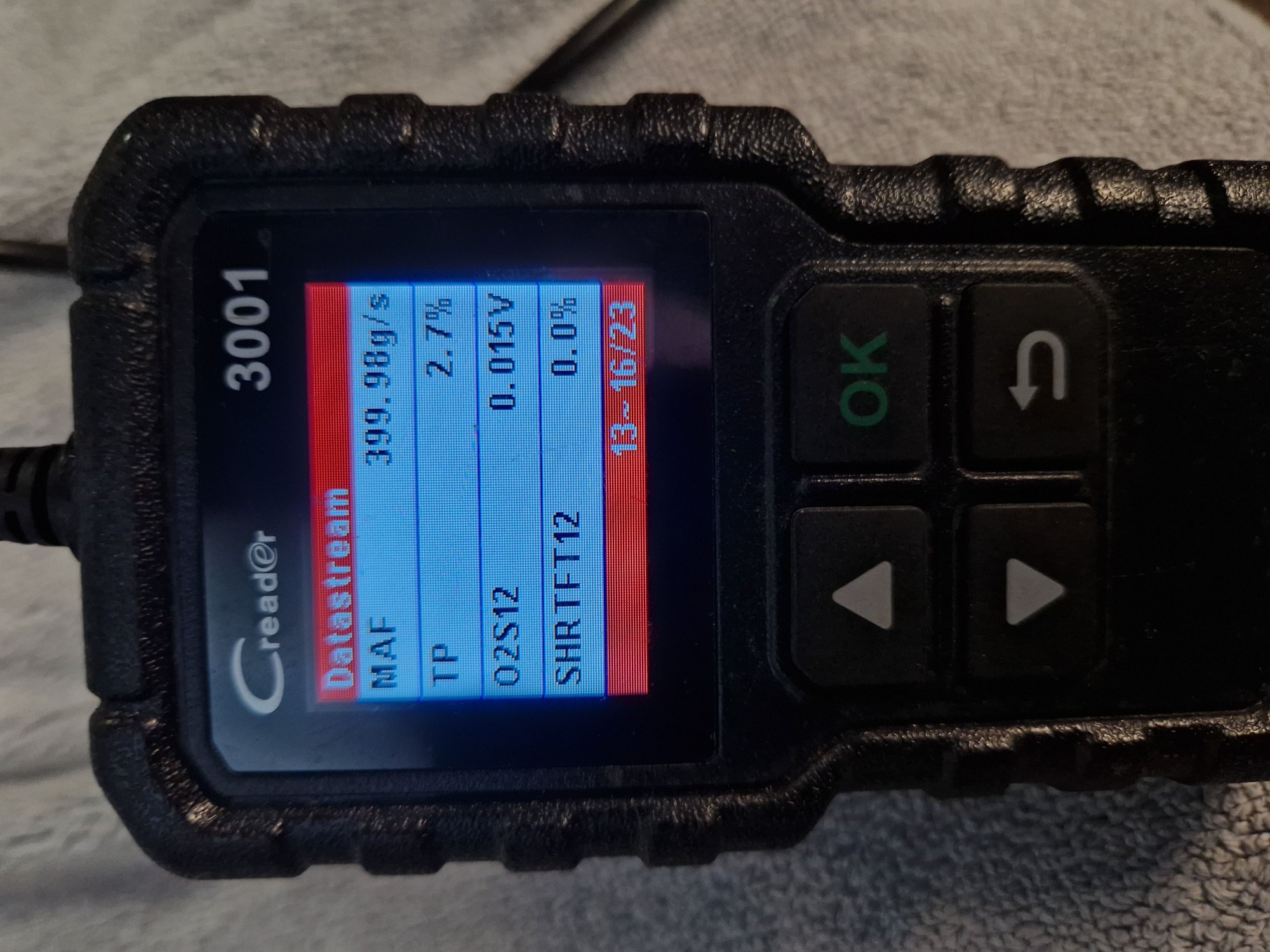 Hi all, after being stood for a long time (8 years) I've got the car back on the road. Trouble is it runs like a dog. Won't accelerate properly and stutters or even stalls. I've done all the usual maintenance, plugs etc but no better. Took her on the motorway this morning and was not running at all well but could coax her upto around 70mph. Plugged the code reader in and got this for the maf reading. I've done a little research and it doesn't look right. Also symptoms of a bad maf match what I'm experiencing. Do you 5hink this could be my problem. I'm sure I've cleaned it a couple of months ago as part of maintenance.