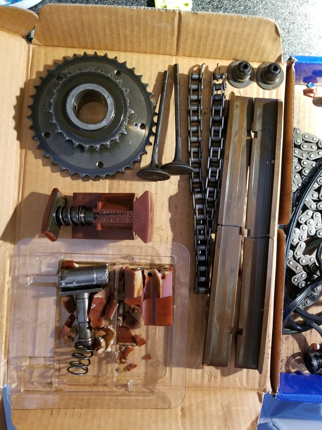 1. If you haven't replaced your tensioners, do it NOW!! It's not so hard if you get the right tools and follow the right process. I thought my tensioners were good, but they failed. Here's a picture of all of the broken bits: