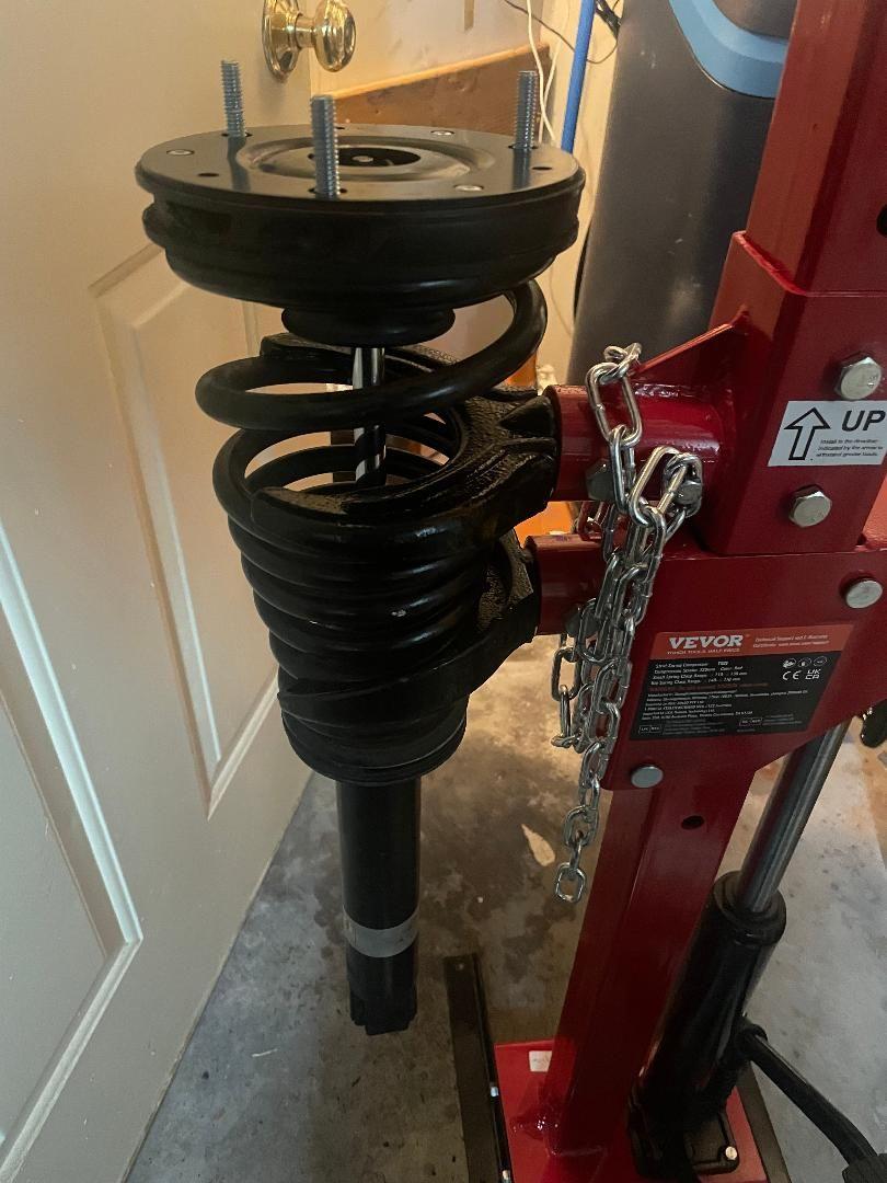Regarding the press, I actually don't have one, and so if a press is actually recommended, I would likely need to take these to a shop. The first time I did this, I rented the spring compressor tool from the local parts house. I got it done, but that seemed a bit on the scary side if something were to fail, and since that time, I've ended up with the hydraulic spring compressor, which actually seemed to work much better as far as taking the pressure off.