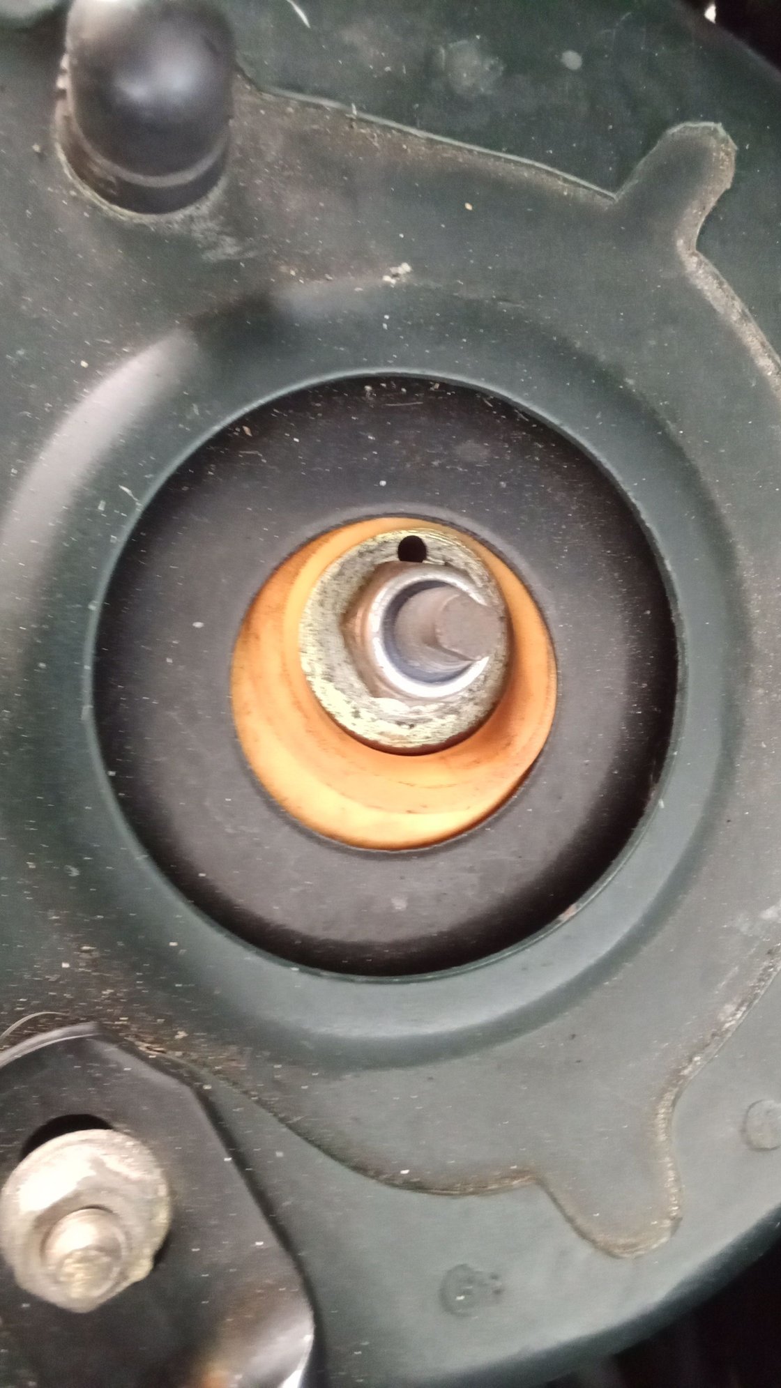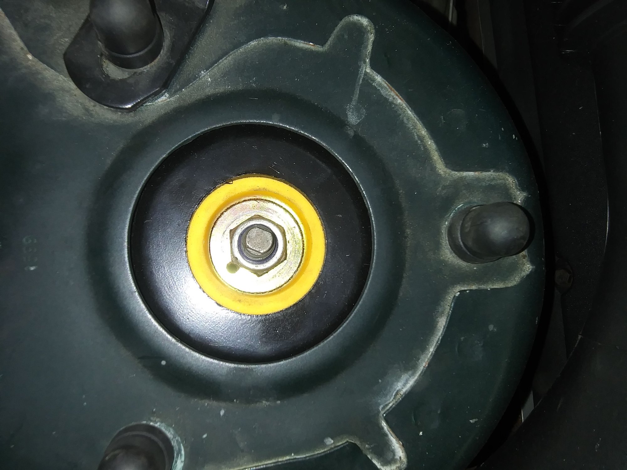 Hello John, thanks for the response. Yes, the beginning of the string was about a 1/2" difference in ride height, the cause of which I am still trying to find. Yes, the shock mounts were replaced in August, about 800 miles ago and the movement of the shock stud to off center took place nearly immediately. The "plates" inside the shock mount seem to not be fixed in place and can shift around - I just don't know why the drivers side shifted off center. The passenger side (the side that is the 1/2" higher) is perfectly centered. Driver side Passenger side