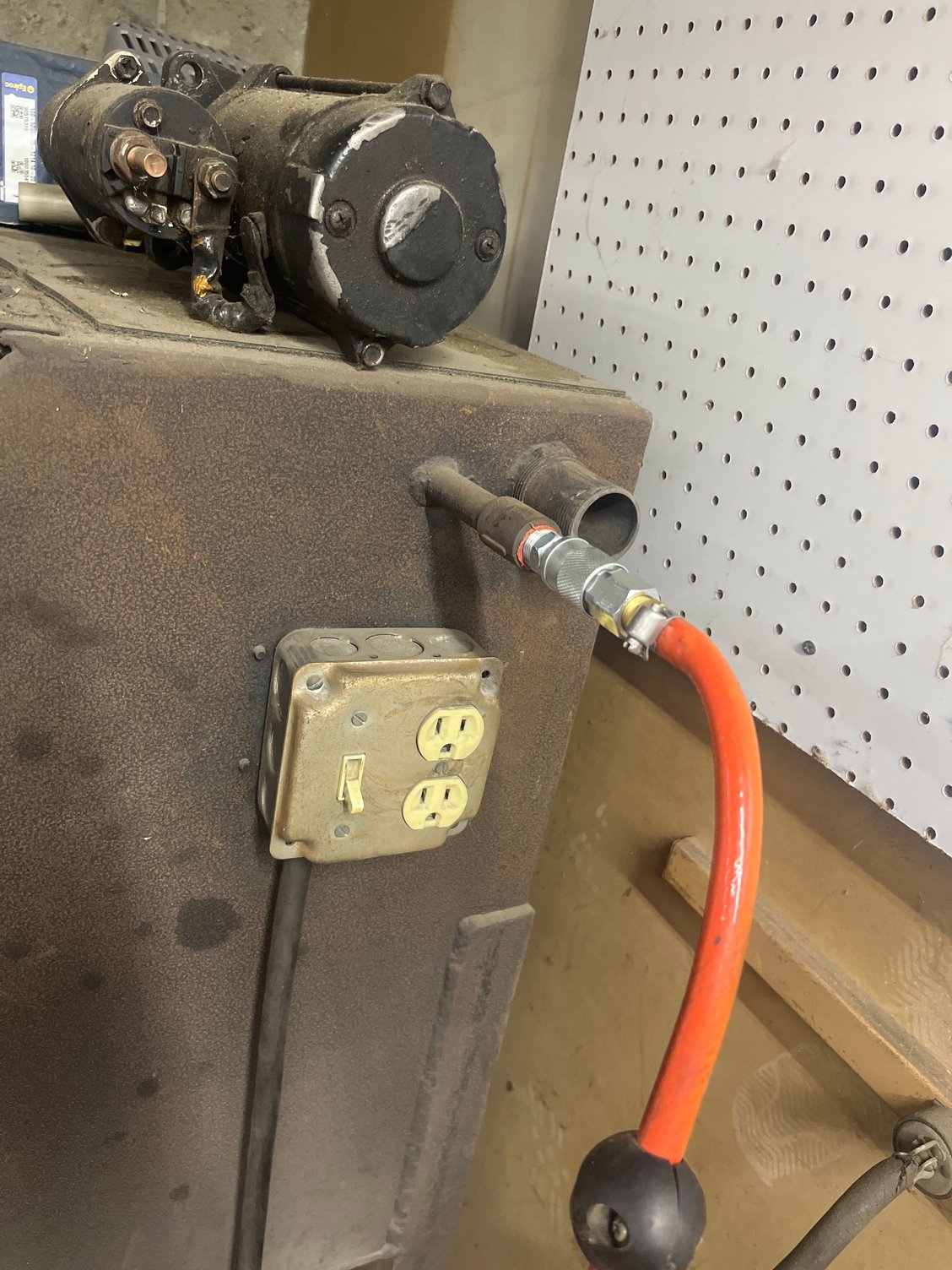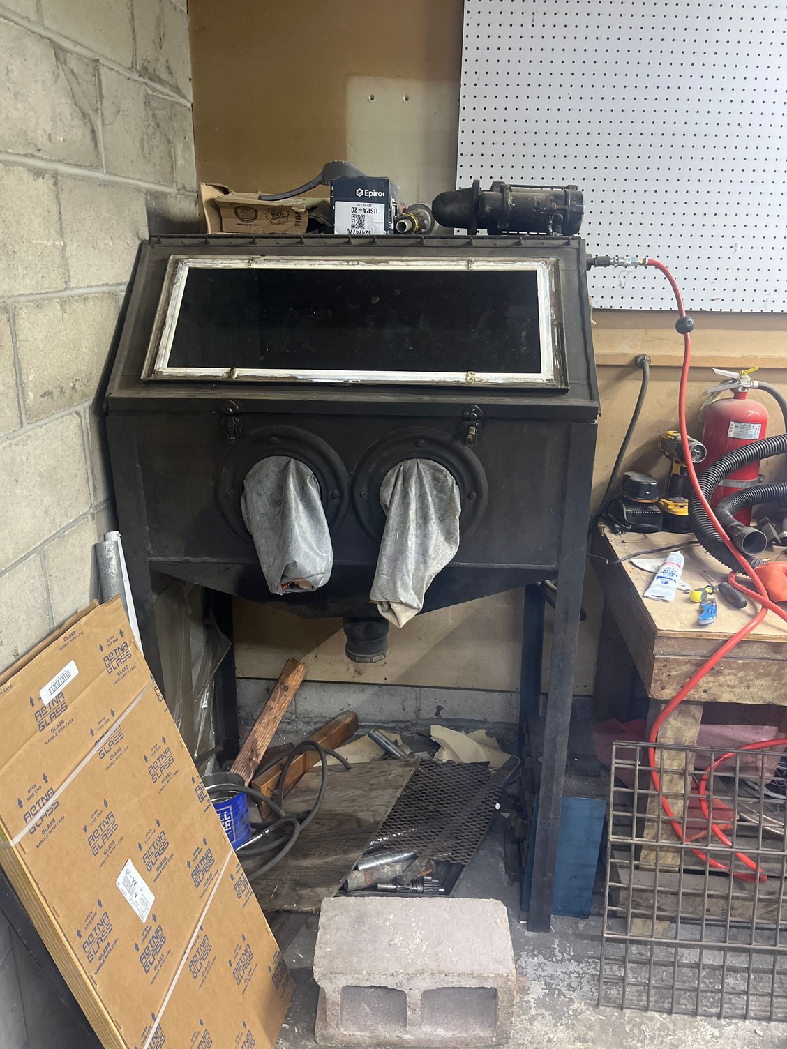 Can’t lie I know nothing about sandblasting cabinets. This one came with our shop and I haven’t messed with it for the last three years until now. Our shop used to be a motorcycle shop where the guy specialized in triumphs and bsa, as well as others(he was in a lot of magazines and world known) I have no idea how he had it set up and can’t ask, cuz he’s passed (god bless). I’ll post a couple pics Cabinet with new glass lol Compressor I think that ran it (also came with the shop) Only inlet and outlets I see, larger pipe is where I put the shop vac on…. Won’t be doing that again lol