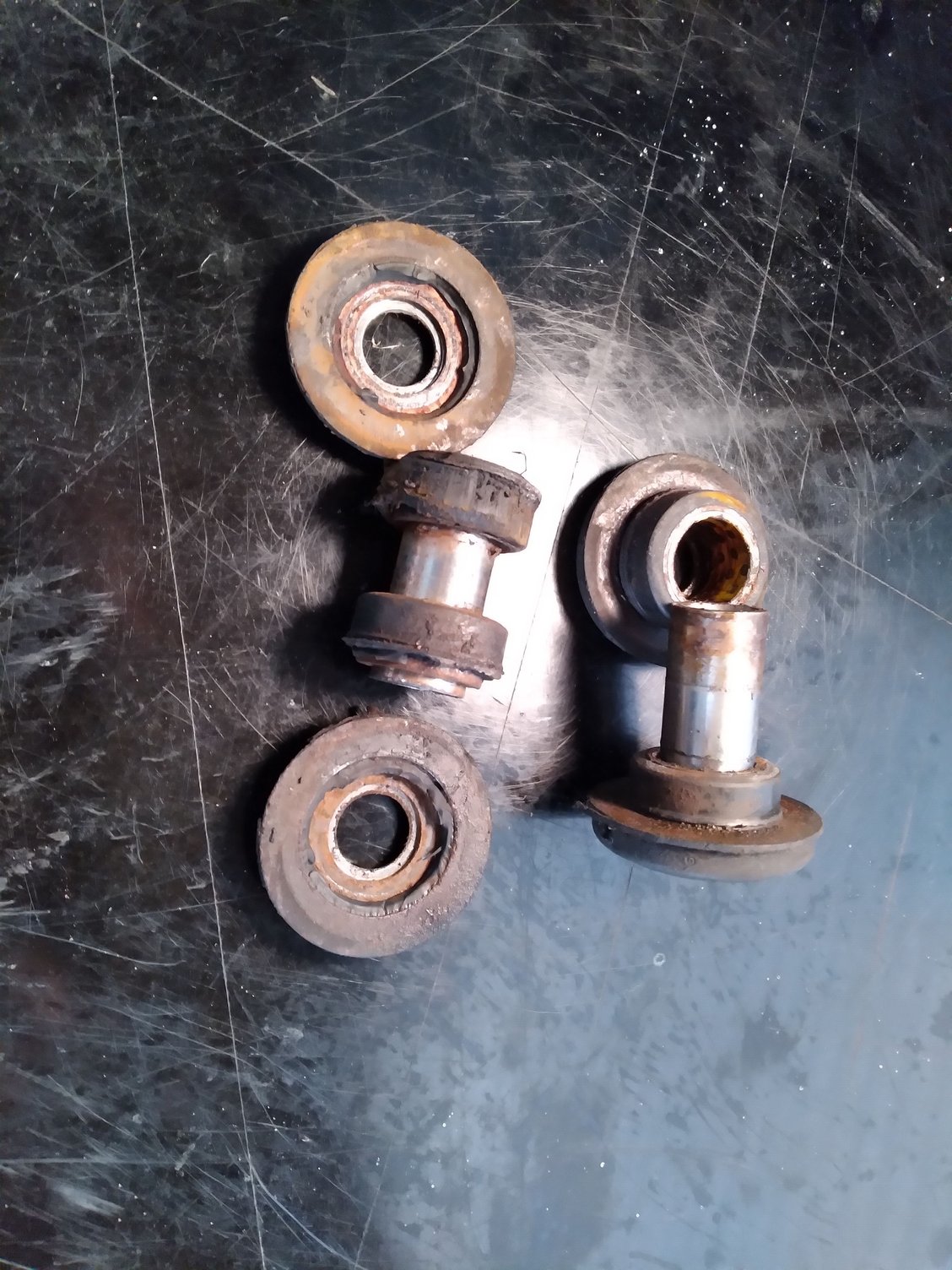 Here is what the bushings look like. One sleeve slid right out of the control arm once I got one bushing off. The other one put up a fight, I imagine due to part of the bushings remaining on the sleeve.