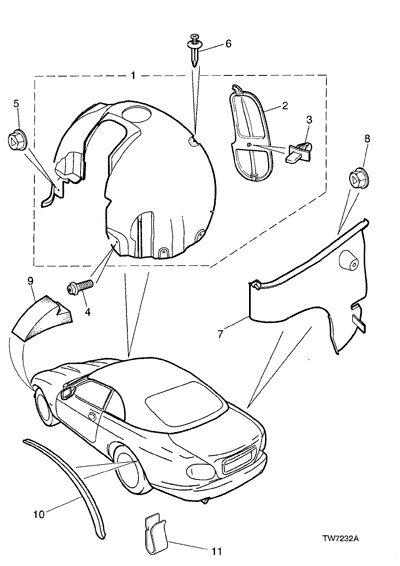 I have recently seen two X100 XK8’s with small splash guards attached to the upper corner of the rear wheel opening and continue down. They do not go below the fender. They are not a mud flap. They’re only stick out about 1-2 inches.