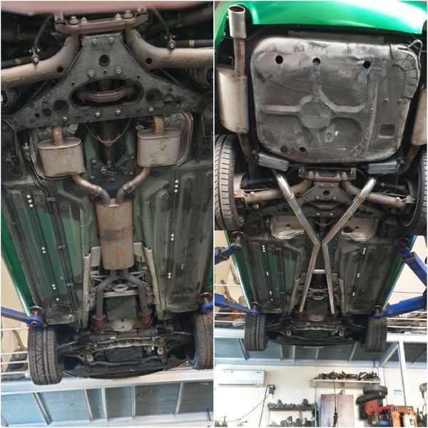 My next move was to get rid of the big resonator that joins the exhaust streams from the two cats. Based on research from this site, I had the exhaust shop (Lou's Custom Exhaust in Waltham, MA) weld in an X-pipe to merge the pulses for both sound and performance. At the time of this job, I'd put the rearmost straight pipes back on, so now that I had only two out of the original five exhaust cans in place, it sounded pretty gnarly:
