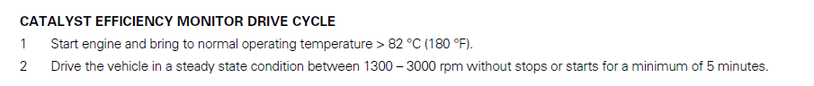 There is also a Cycle for "Catalyst Efficiency Monitor" which says to : 1. Start engine and bring to normal operating temperature > 82 °C (180 °F).