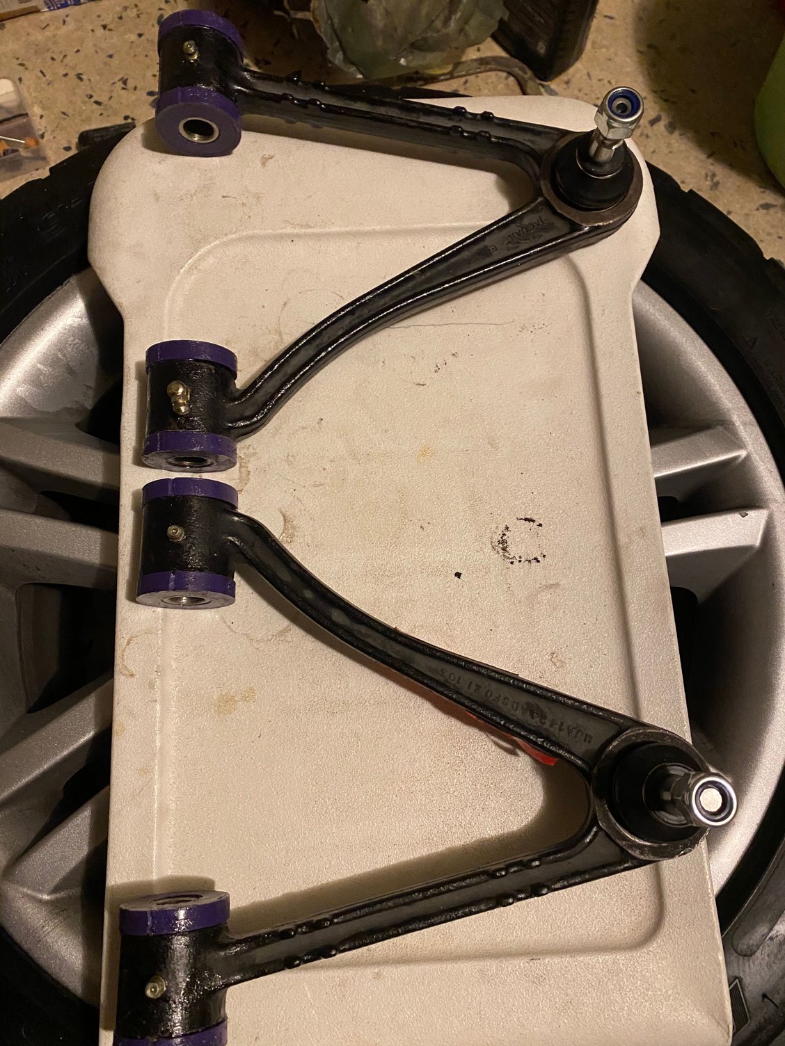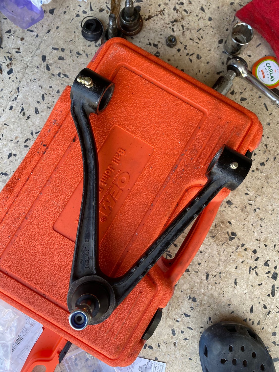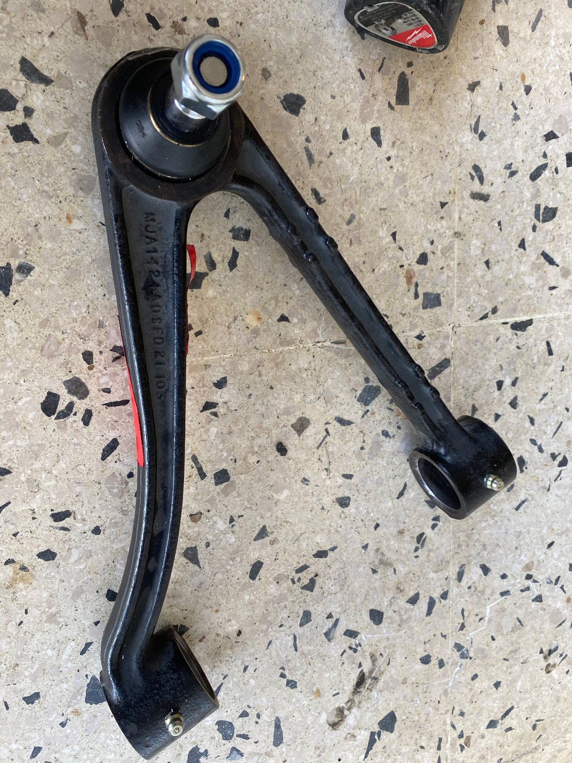 Final product: New ball joints, and new zerk fittings. The bushes were greased using Hotchkis Super Silicon grease. That stuff is extremely tacky, it took me 30 minutes to get it off of my hands.