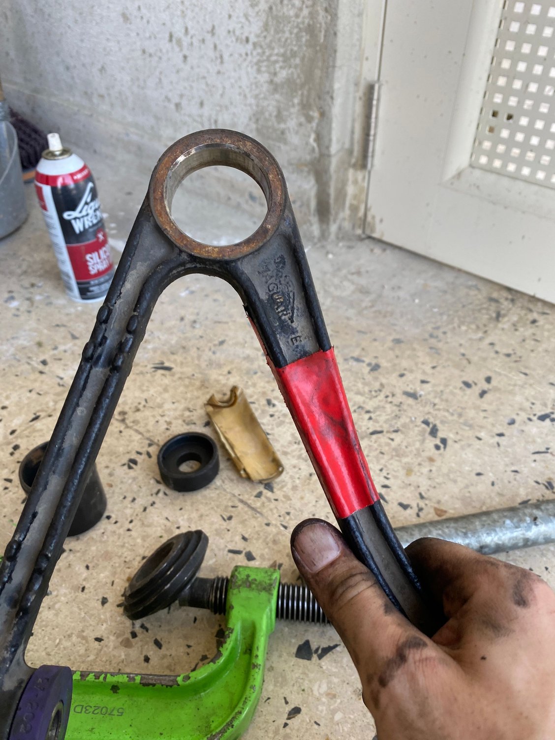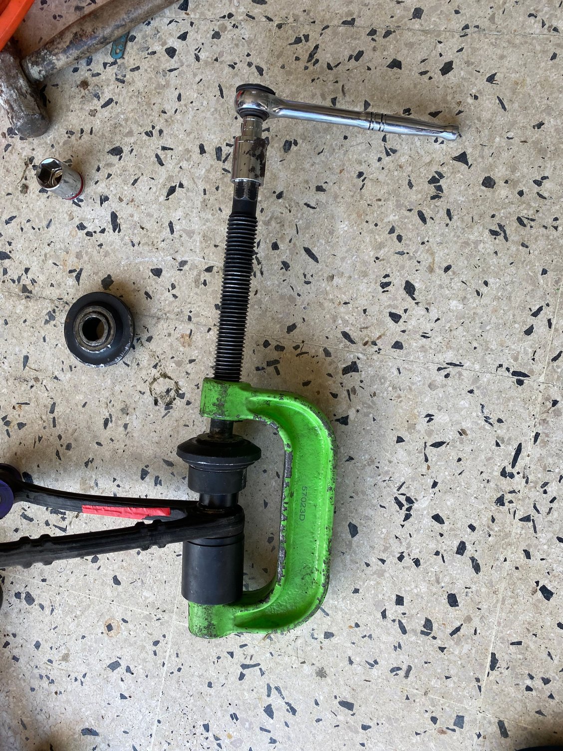 I then used a C-clamp press to R & R the ball-joints. Next I drilled and tapped the control arm bushes and installed some Zerk fittings for a grease gun. I was now about to modify the powerflex bushes by adding grease channels to them, but it turns out my dremmel is damaged and won’t turn on. I am now off to the store to buy a new one.