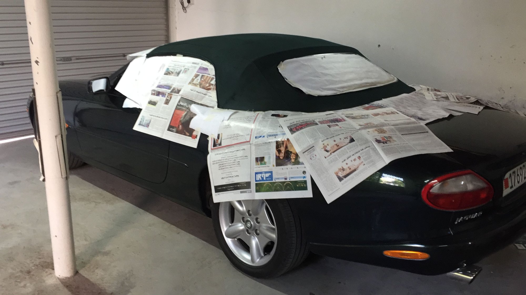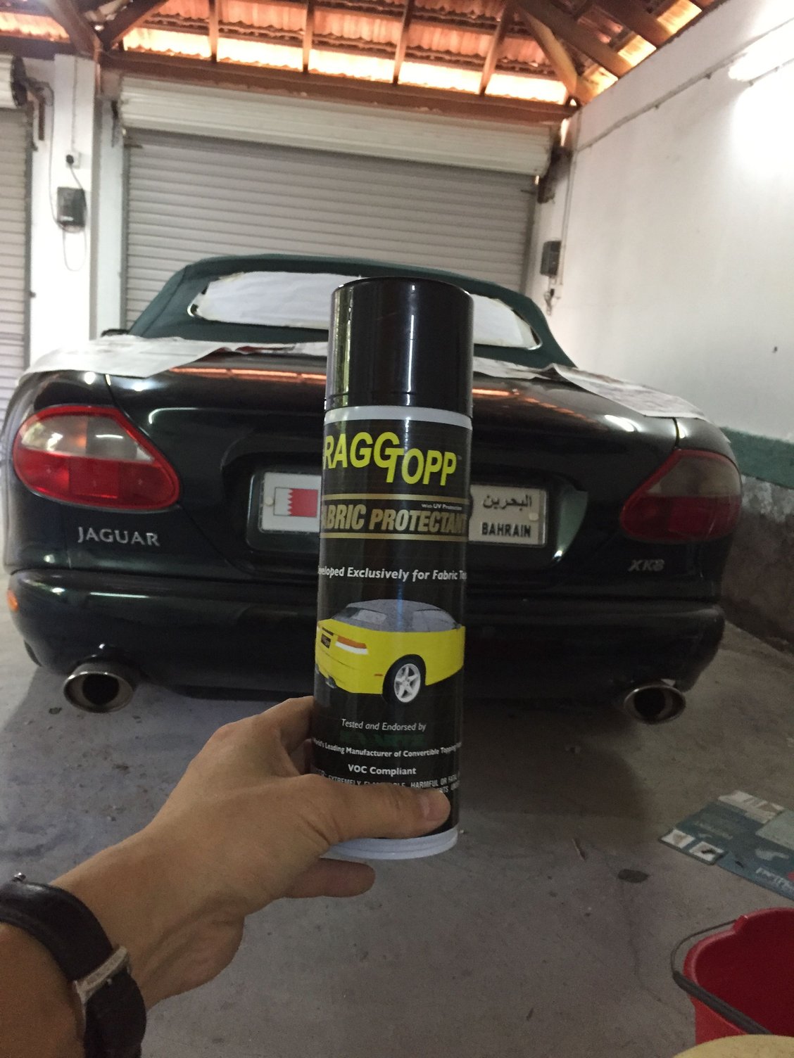 With the wet weather season coming in the Middle East, I knuckled down to spray the convertible top with Ragg Topp sealant. First was a vacuum hoover, gentle shampoo wash, let it dry then hoover again.