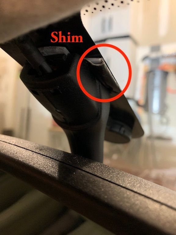 With light, it turns out the mirror had been 'shimmed' to keep it in the mount like below (the mirror is extremely loose without it so, some kind of shim will go back in). I'm grateful that they left a bit on the outside so I could remove it. Will do the same when I reseat it.