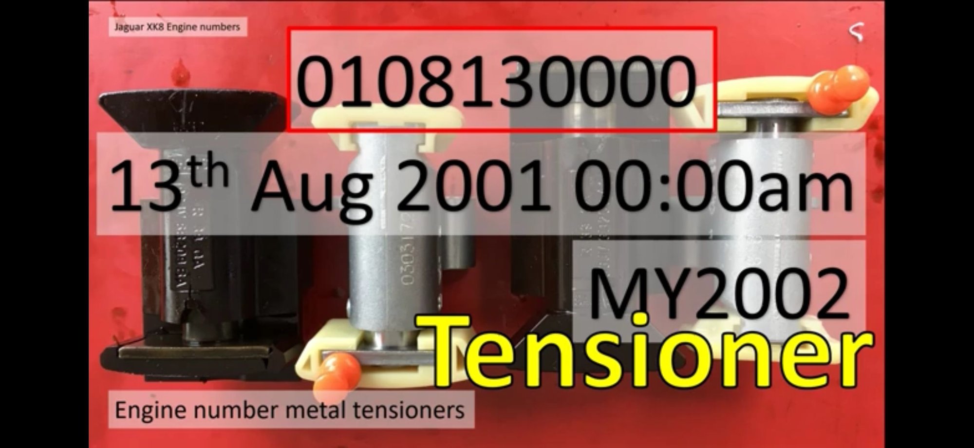 Remember that the metal TC tensioners came on all AJ engines built after Aug 13, 2001. To see this date you have to look at the left side of the engine block, which is easily done (haha) with a smart phone and a flashlight. Don't jack the car up, just stick the flashlight (damnitall, i mean torch) into the engine compartment near the torque converter (shining forward) and put your phone next to the block. You might find that the 2002 in question was produced after that glorious date. The picture of the block is my 2002 engine (02/02/2026) that went into my car, build date of April 2002 on the door. You can see that it took two months from the engine build to rolling off the assembly line.