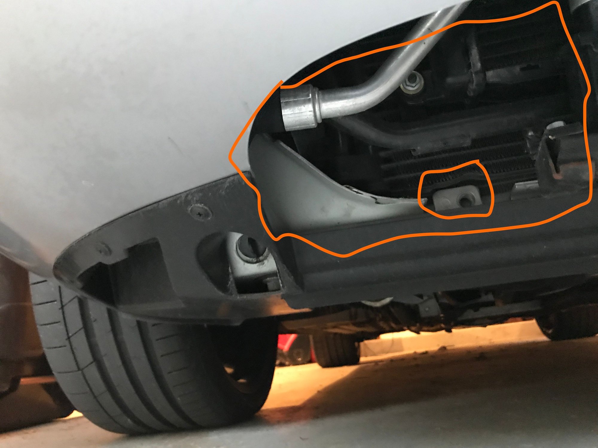 the areas circled in your picture are normally open and the bolt threads are unused, perhaps for an optional cooler. the car is partially a bottom breather as the grille area is insufficient.