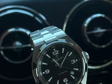 British Racing Green, gold stripes, champagne leather