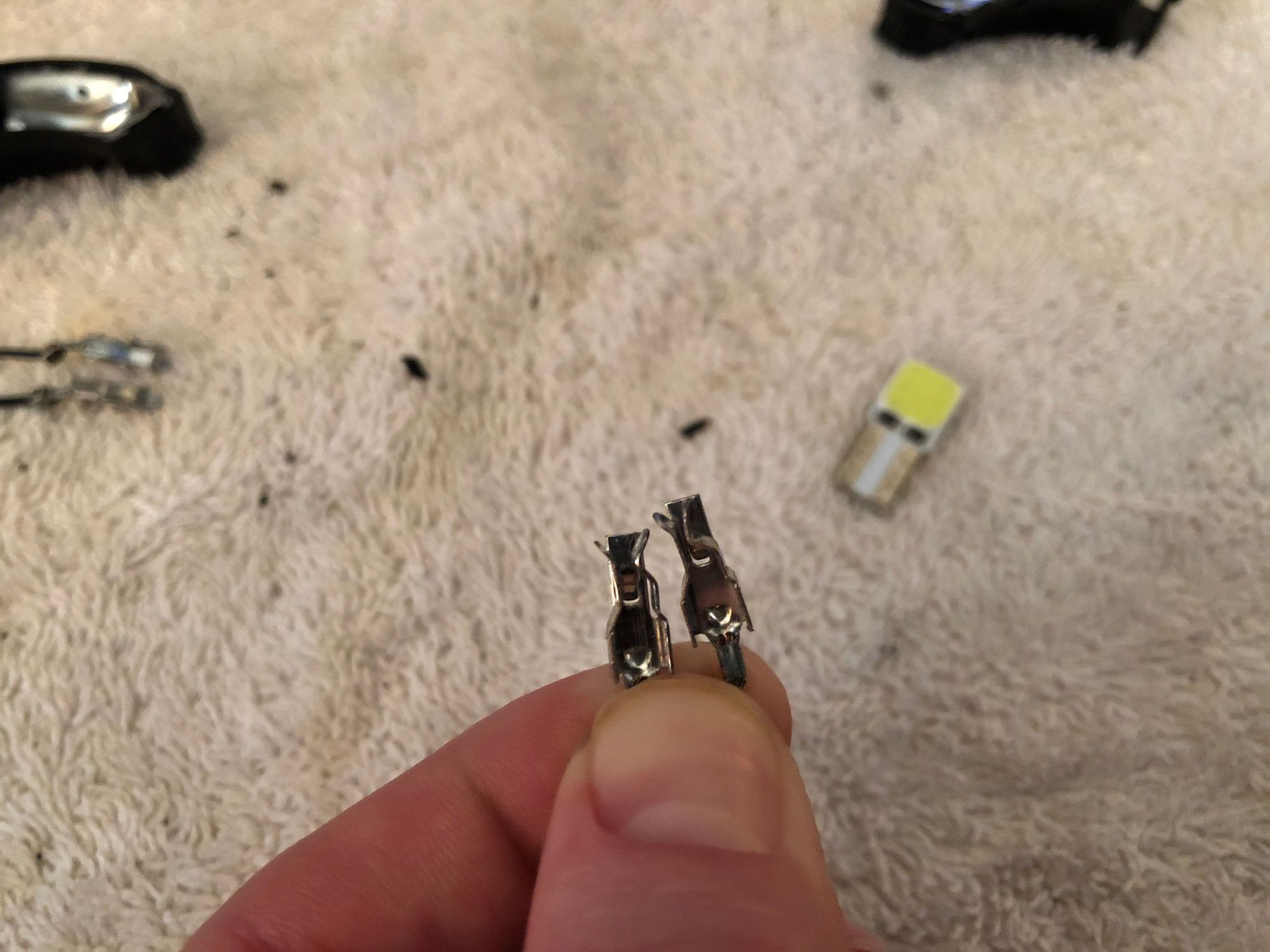 The original glass bulb, not pictured, does not plug into a normal style socket. Instead these small clips attach to the contacts on the bulb. I believe this is done to save space. At this point, it is a good idea to bend the tabs slightly closer together to provide more friction against the new thinner LED. Note the tighter gap on the terminal on the right.