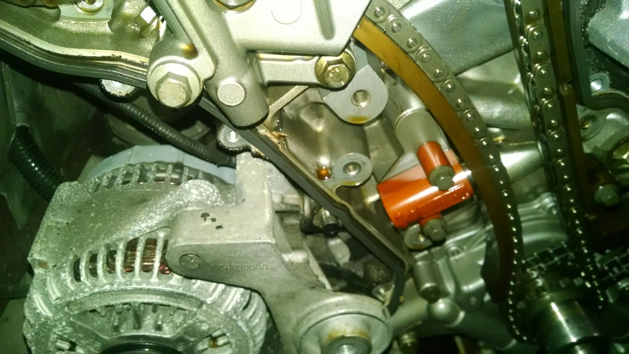 Right bank primary chain, tensioner, and guides. The alternator is into the picture on the left.