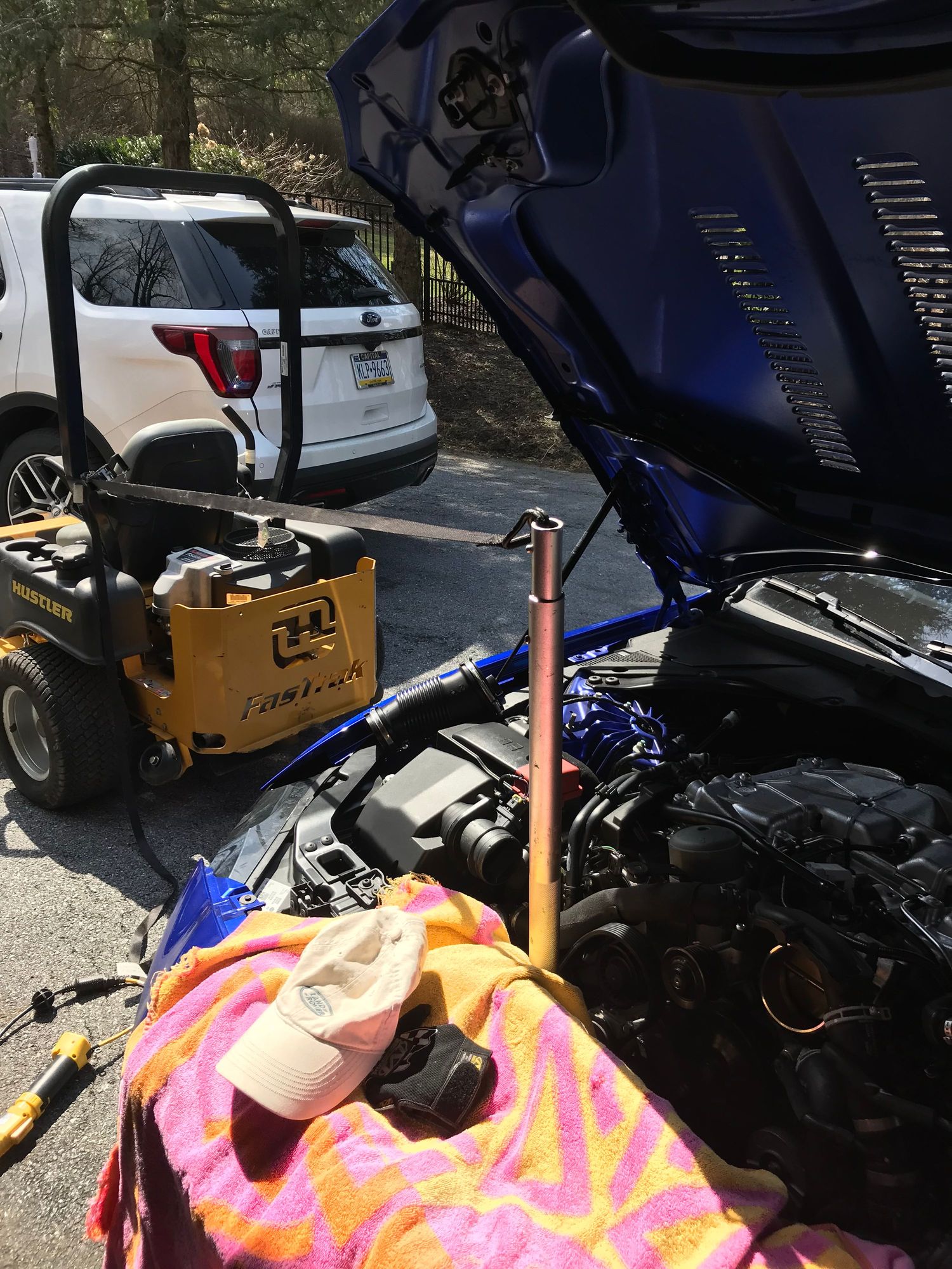 Needed a third hand so I put a jack handle on my ratchet used to release the belt tensioner. Hooked a ratchet strap to the jack handle and tied the strap off on the family lawn mower! American ingenuity.
