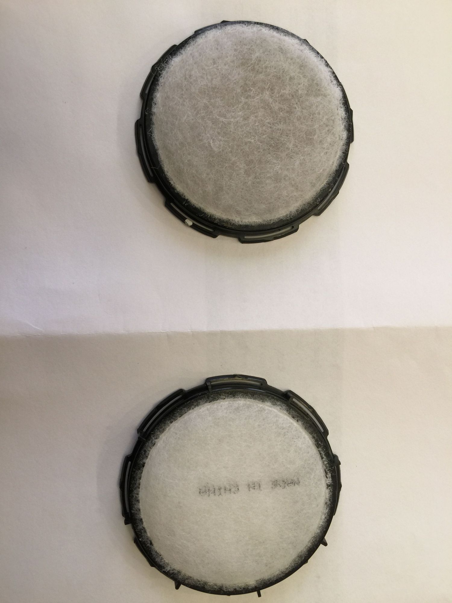 Used backrest filter on top. New Ford filter (Motorcraft FS-100) on bottom.