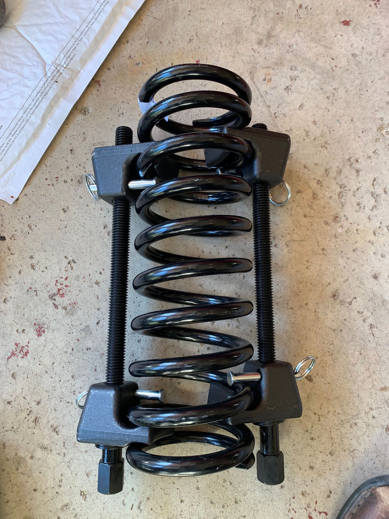 The strut compression tool I borrowed. Note the shock is not included so I could better show the large clamps