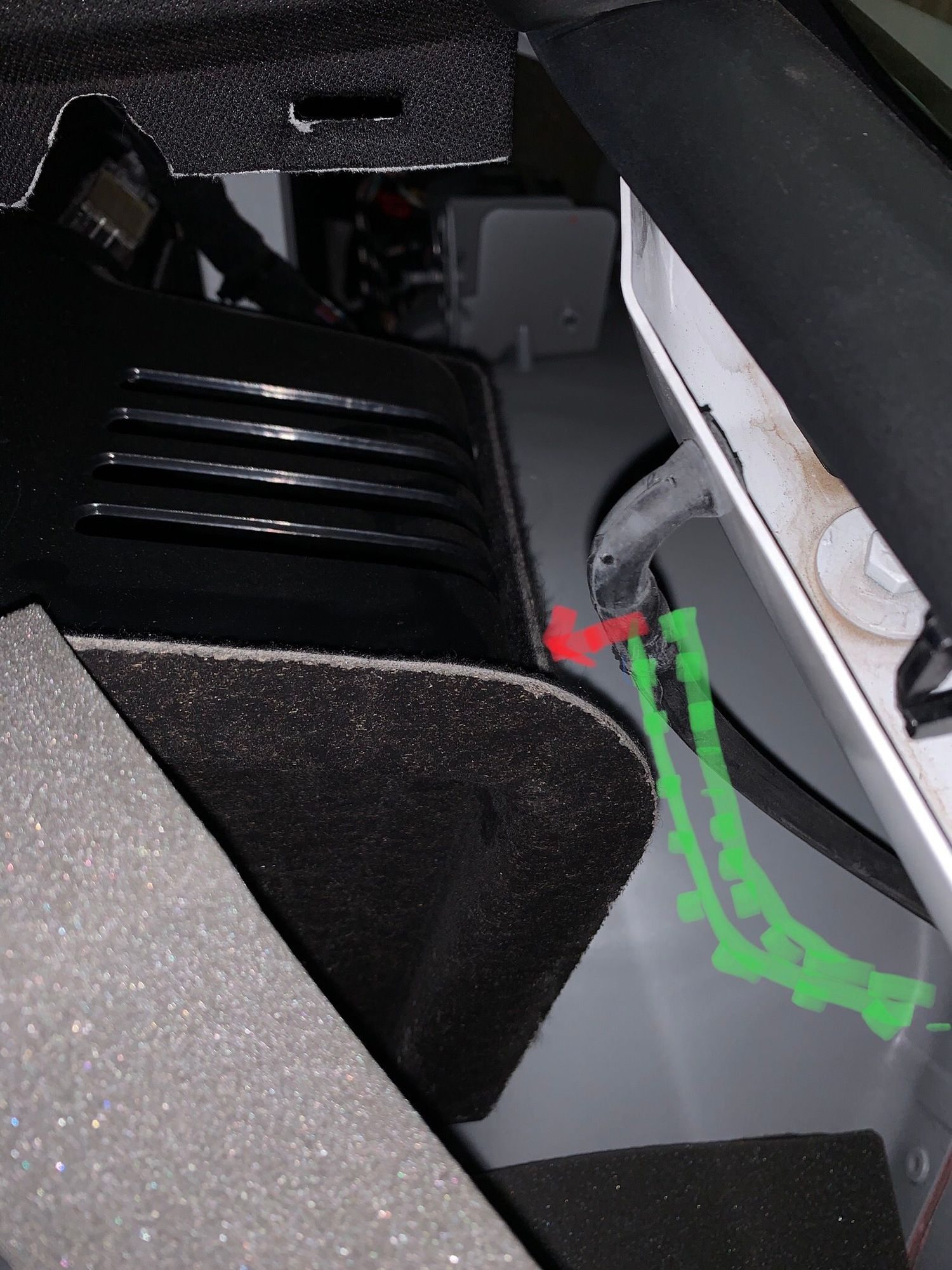 The rear side window drains can rattle against the plastic part as shown by the red arrow. One of my sides was clipped into a holder right at the very bottom and will be held taught and away from the contact point as shown in the photo. My other drain was just hanging loose which then lies in the path of the green dots and can rattle. It is hard to put the loose end back into the clip as it is right down the bottom and you are doing it blind and by feel only and you don’t want to create a kink.