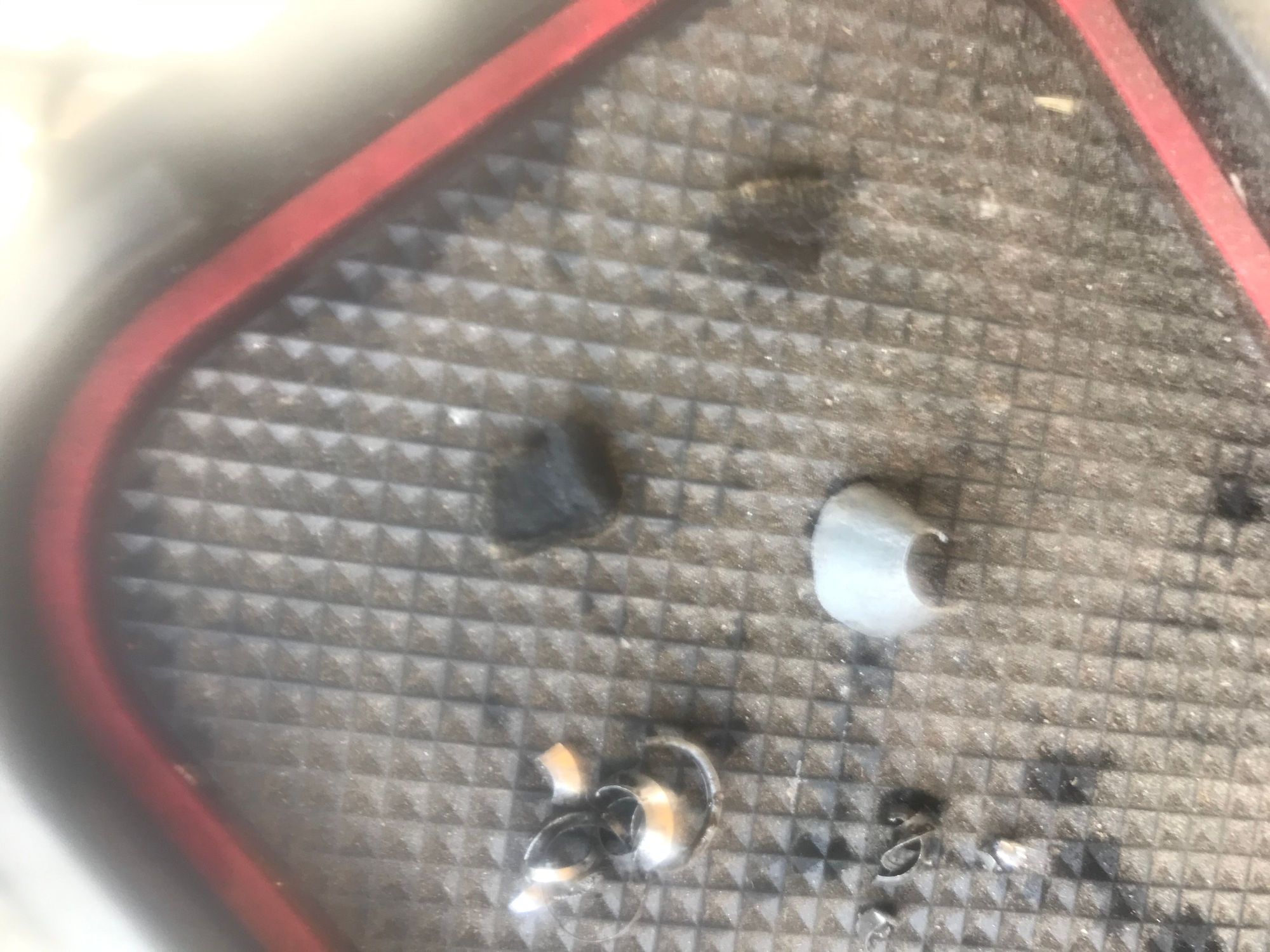 Metal shavings and two plastic pieces.