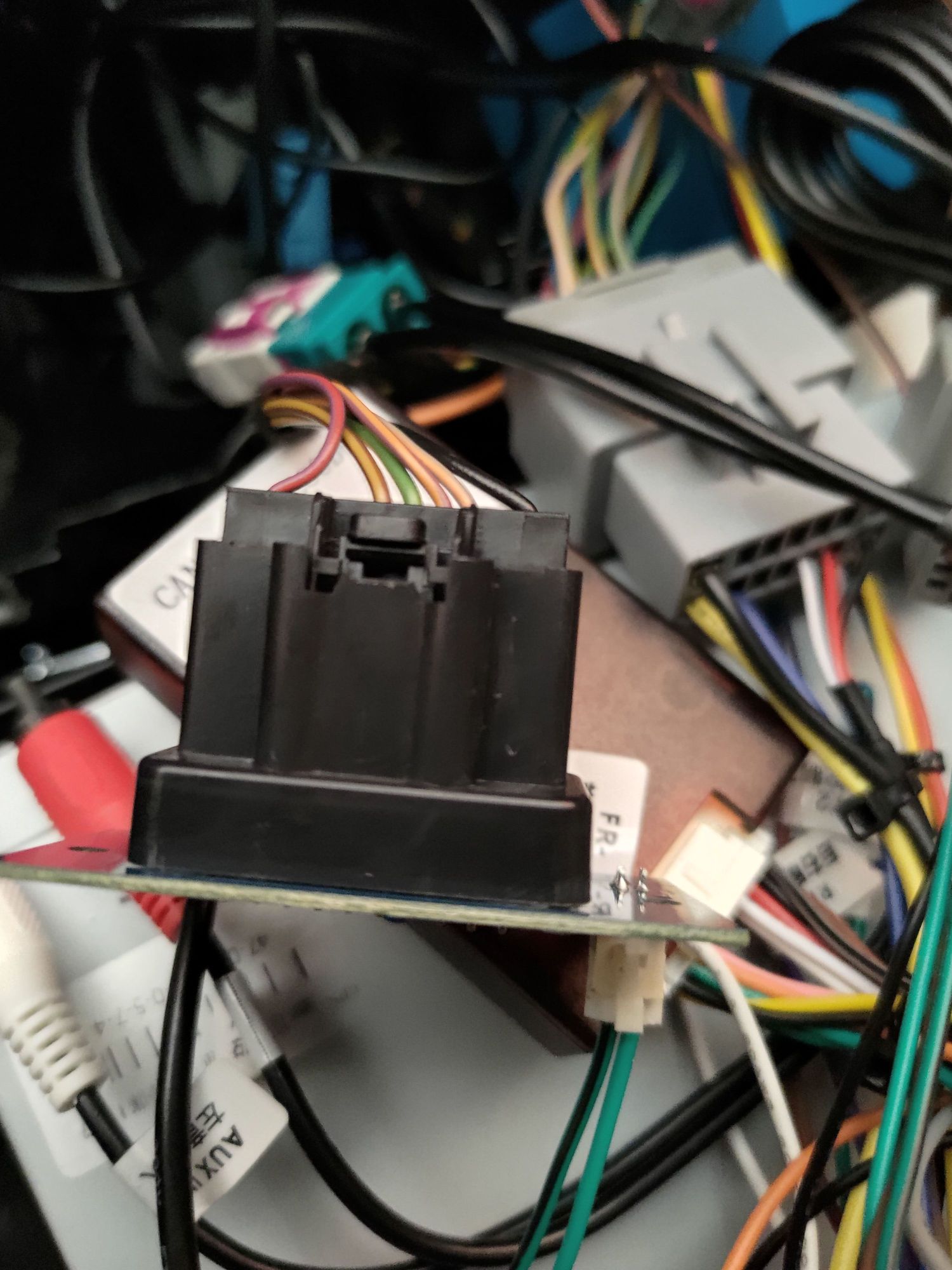 The black connector up front is the harness from the car, going to the connection of the head unit. Disconnecting and reconnecting the small connector with the black and green wire, will turn the hazard lights on. Then doing it again will turn them off.
