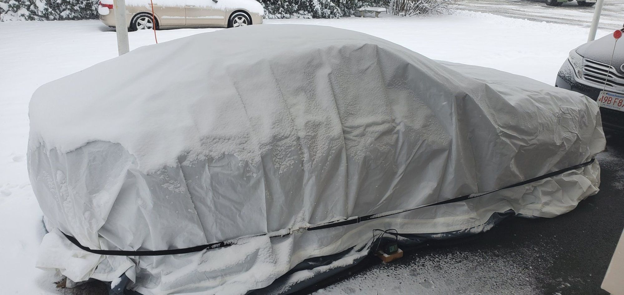 My wife was kind enough to step outside and take this. That's the car pocket in use. You can see the battery maintainer at the bottom. These things are huge so I tucked in the sides and used 8 foot bungees.