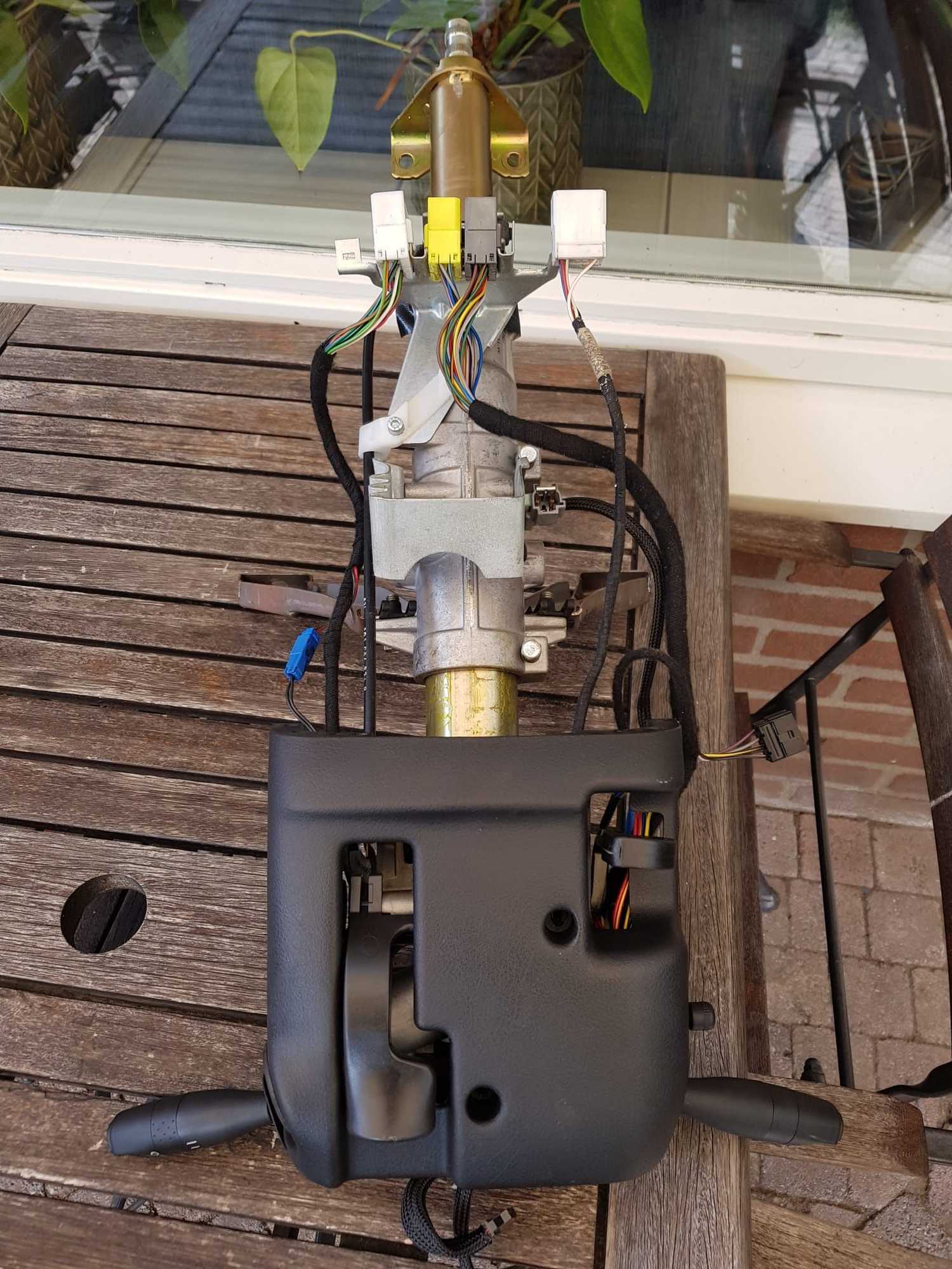 This is the bottom of the steering column, with the cover still in place. The big lever on the left controls the forward and backward motion of the steering wheel and the small one on the right unlocks the tilt-lock if you know what I mean.
