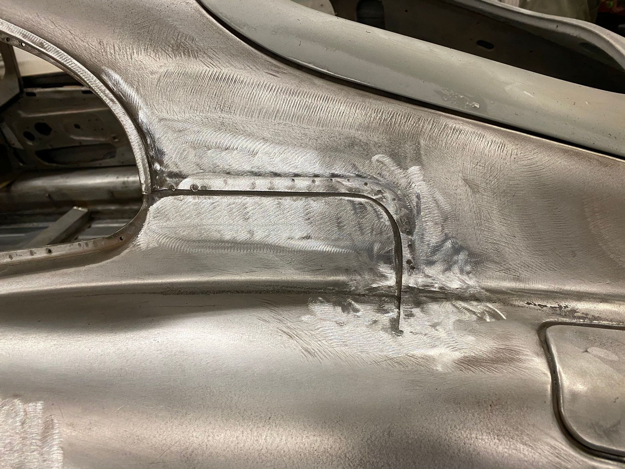 Original seam - lead filled by Jaguar but almost invisible from here back. Ready for fill and skimming