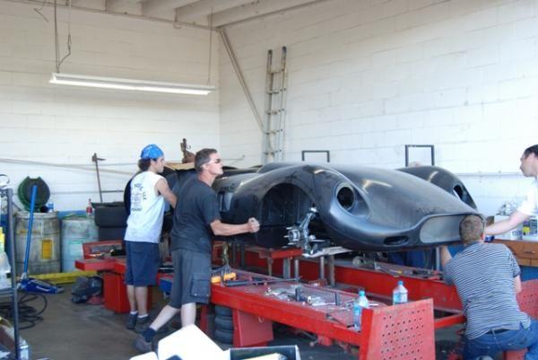 Once the rear portion of the body/chassis bonding was completed, everyone participated in the hood mounting ceremony! This was a critical step as it would determine the alignment of the largest panel of the car. The more hands the merrier! So, I did the honors and drilled the ever-so-critical hood hinge mounting holes. Felt good to get the hood on because it actually started looking like a car