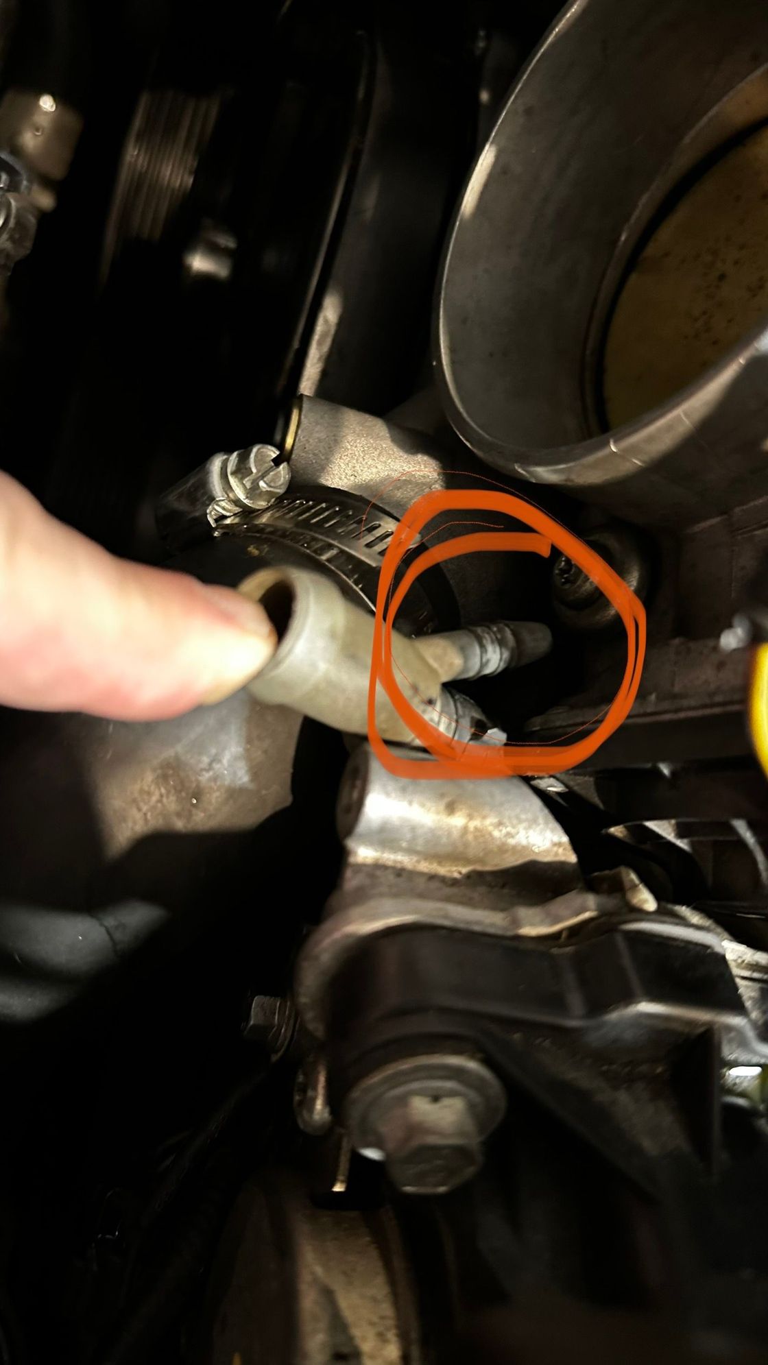 It comes out below the throttlebody