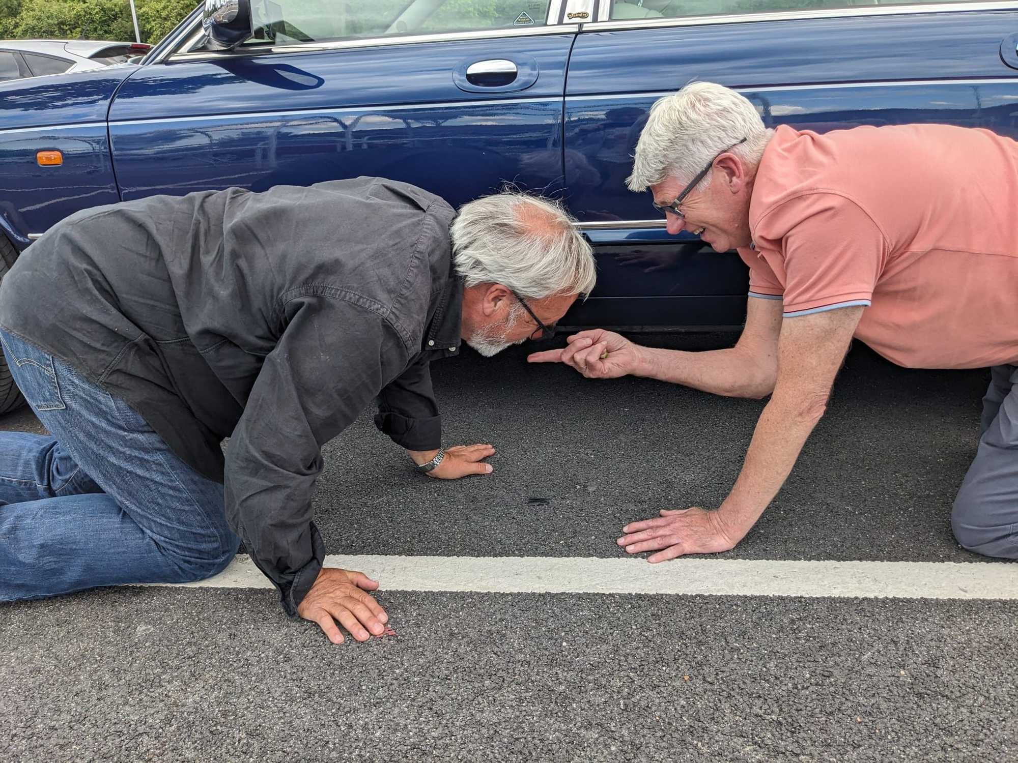 Very dodgy photo of us confirming that the small puddle under the car is, indeed, brake fluid.
