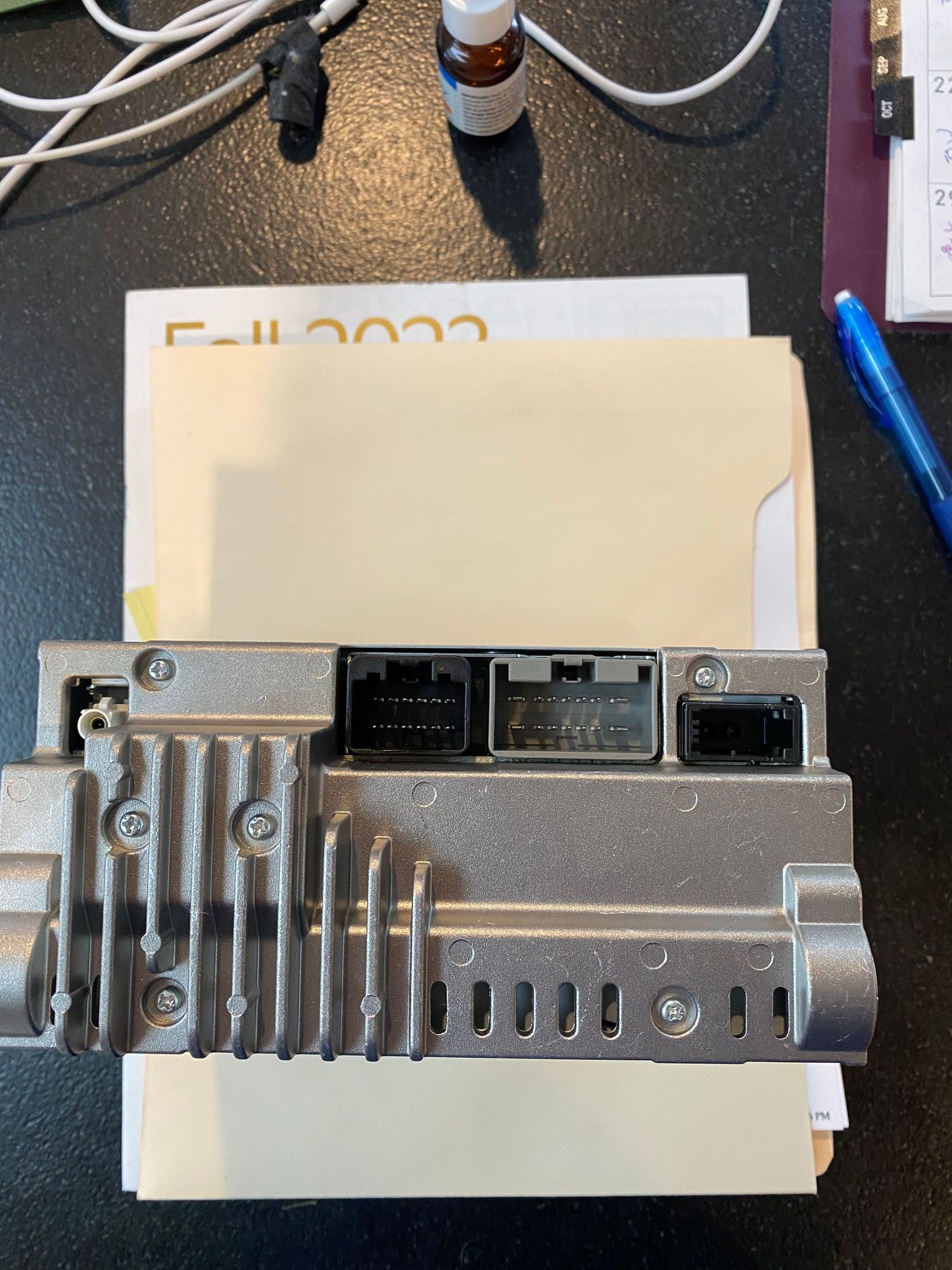 Audio module rear connectors with 3 multi-pin connectors and Fakra coax connector. Module is upside down to get a picture of the connectors.
