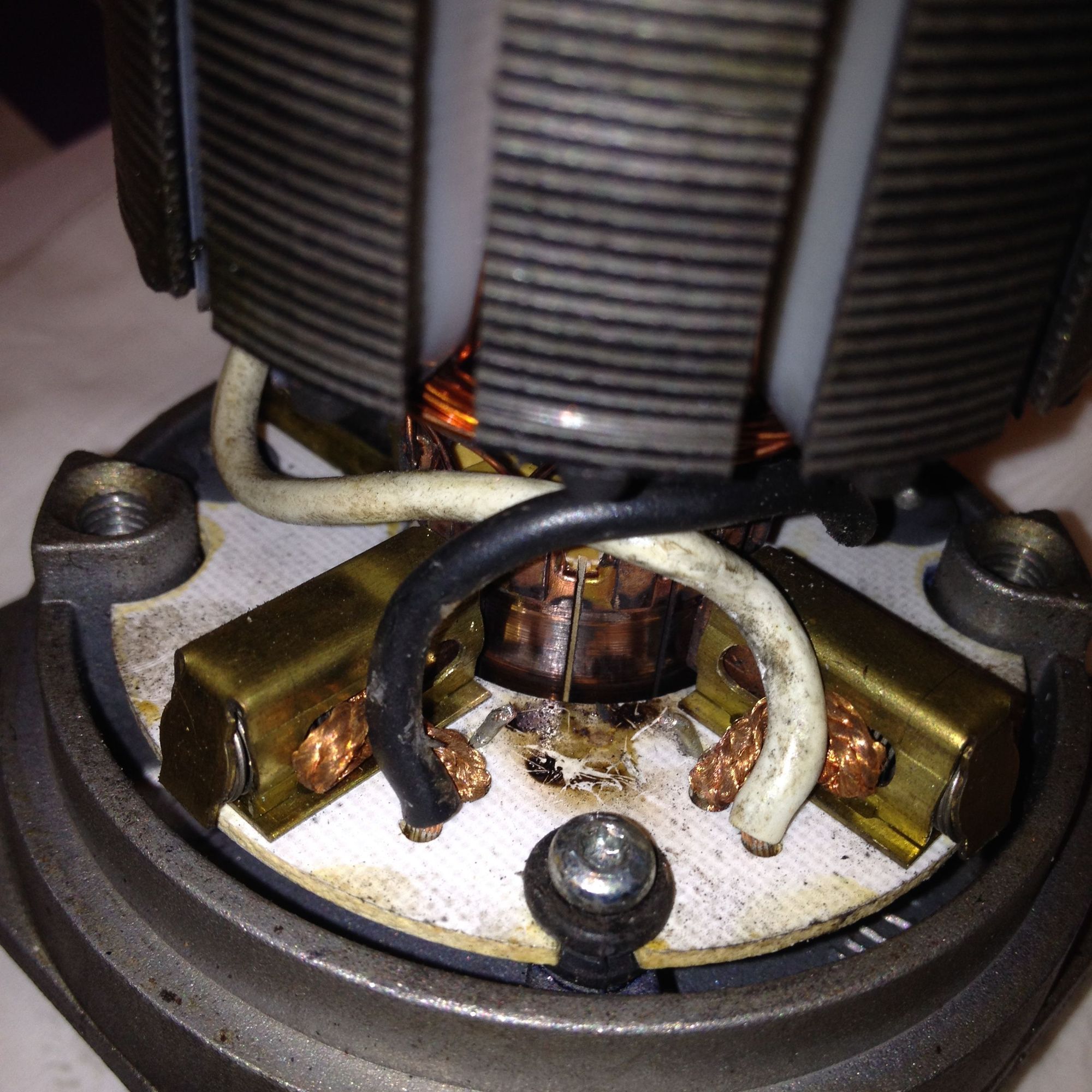 This photo shows where the original TVS was. You can see the burn spot where the leaked oil burned off and the stubs left from where I clipped the leads. The TVS was already split and that actually made getting the snips in there easier as I was able to bend up the two pieces and snip them both close to the bottom.