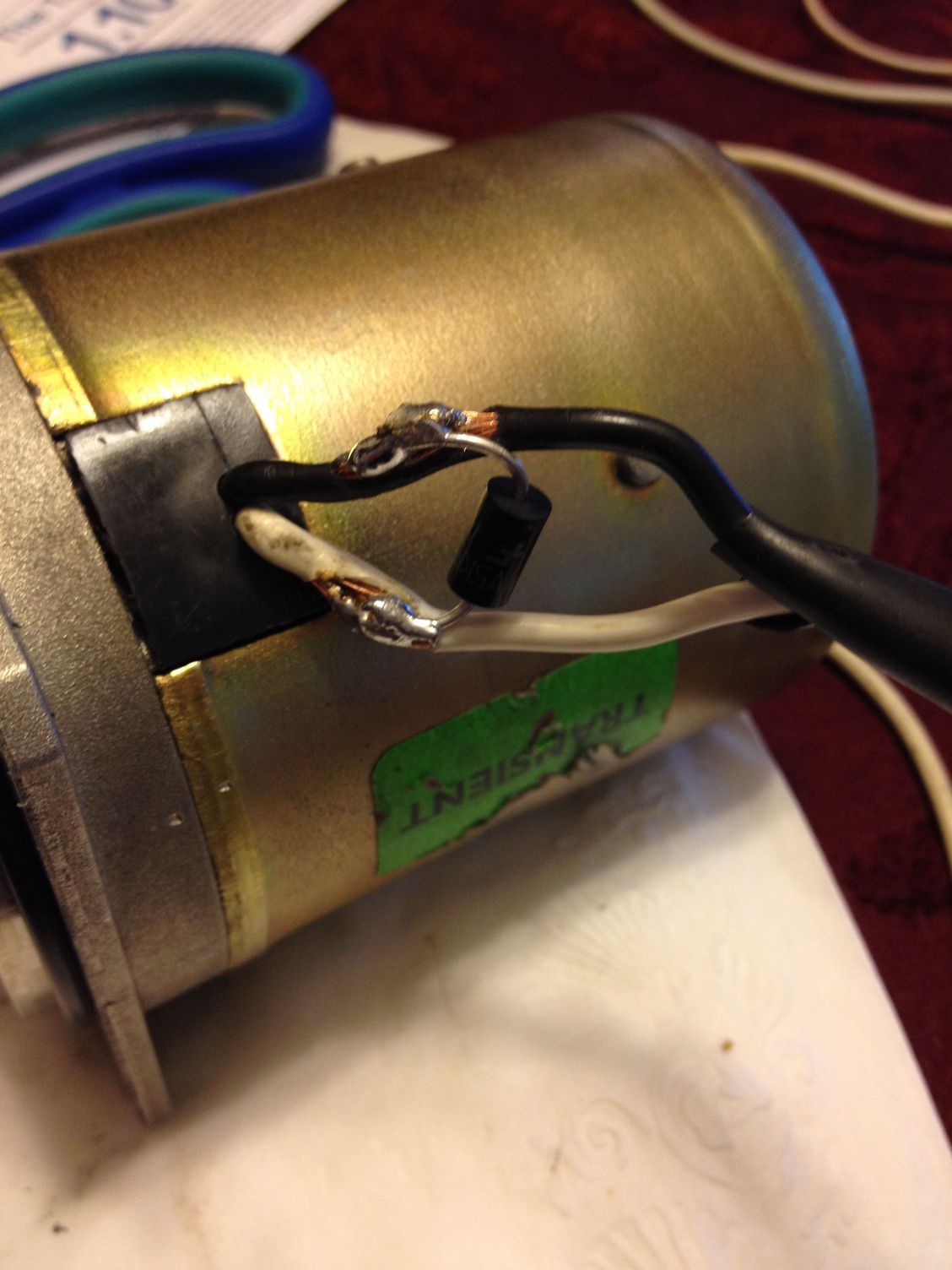 This is where I skinned off some insulation from the wires, close to the motor body. I shortened the leads on the new TVS, jammed them into the wire strands and soldered them in place.