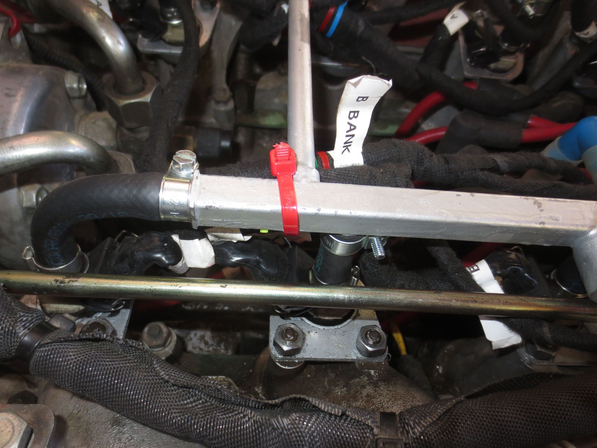 New loom being cable tied to the rail, NOT in the bottom of the V.