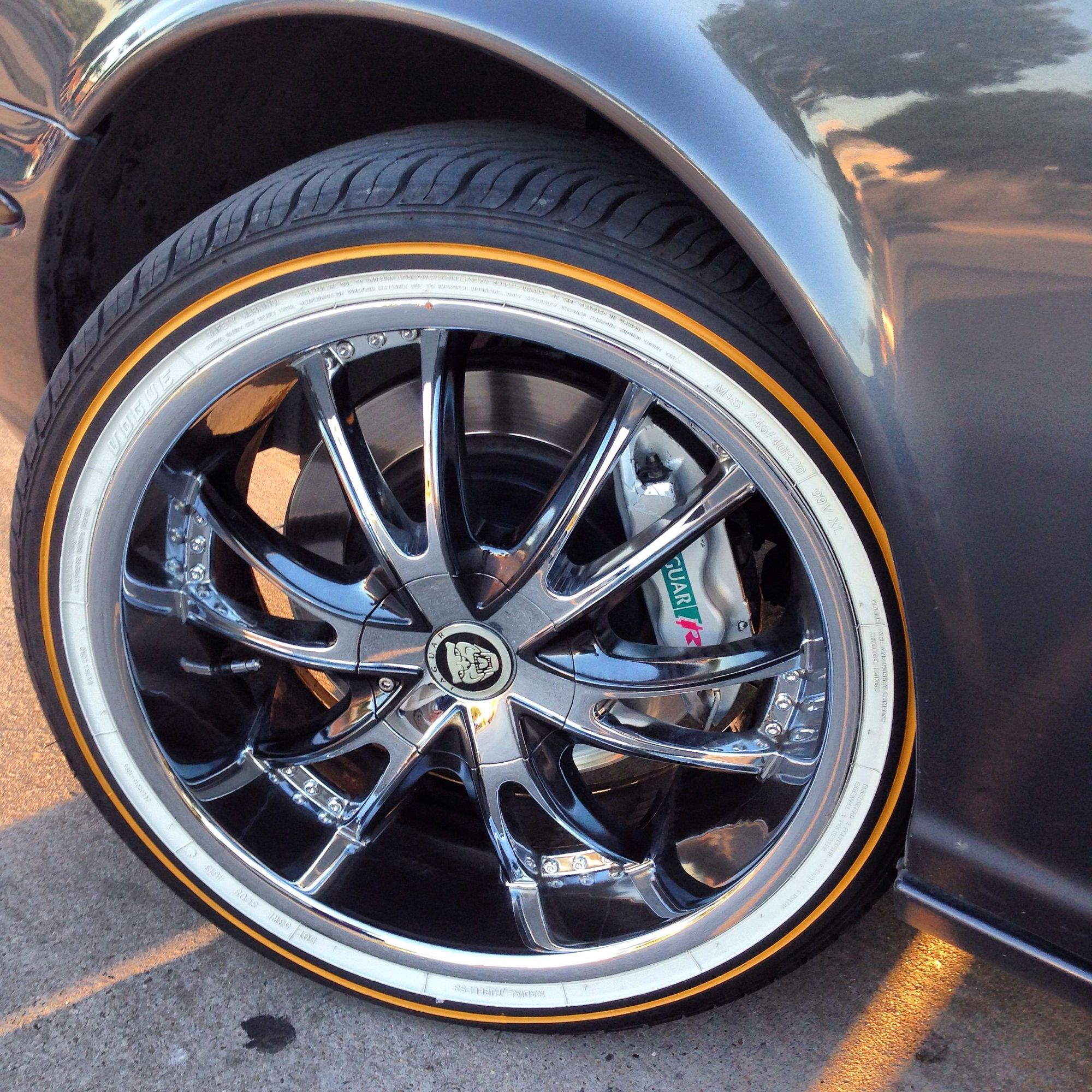 Close up on rim. I got the chrome rims sprayed with a tint of black chrome to match the cars paint. Also got the center cap for rim made with the Jaguar logo!