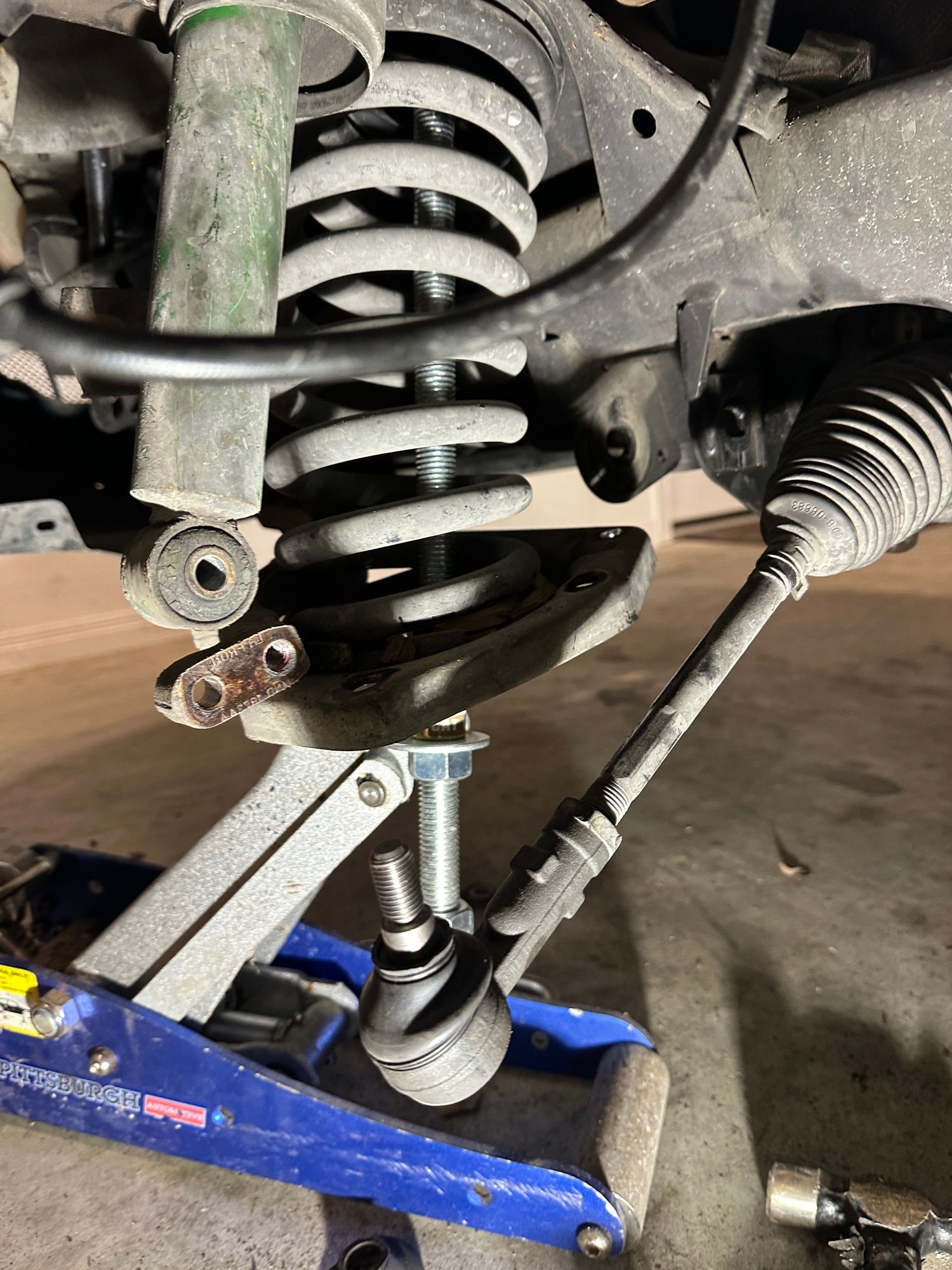 Here's a (so-so) pic of the tool in place within the spring, holding the front part of the lower control arm/plate in place. The jack was "there" but not actually doing anything.