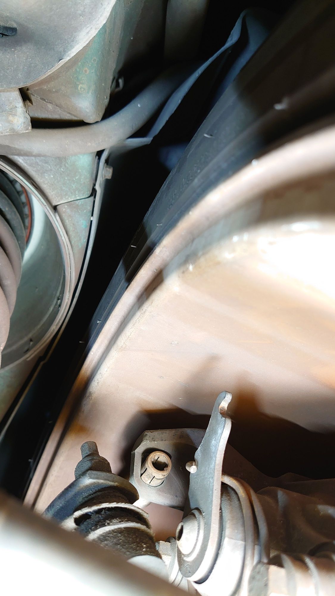 Brembo parkbrake caliper showing RH parkbrake cable sheath end, still secured. As hook end of cable had snapped off I was able to pull cable out through from the other side.