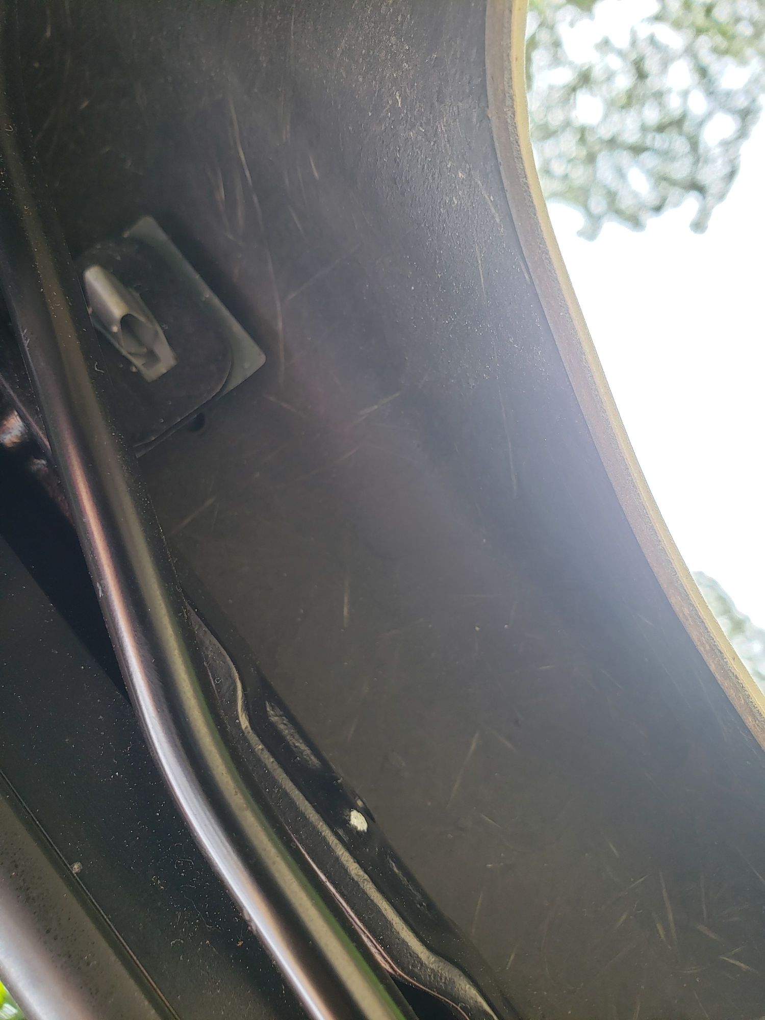 Push type fastener about 10" from the end-most fastener on the side cover.