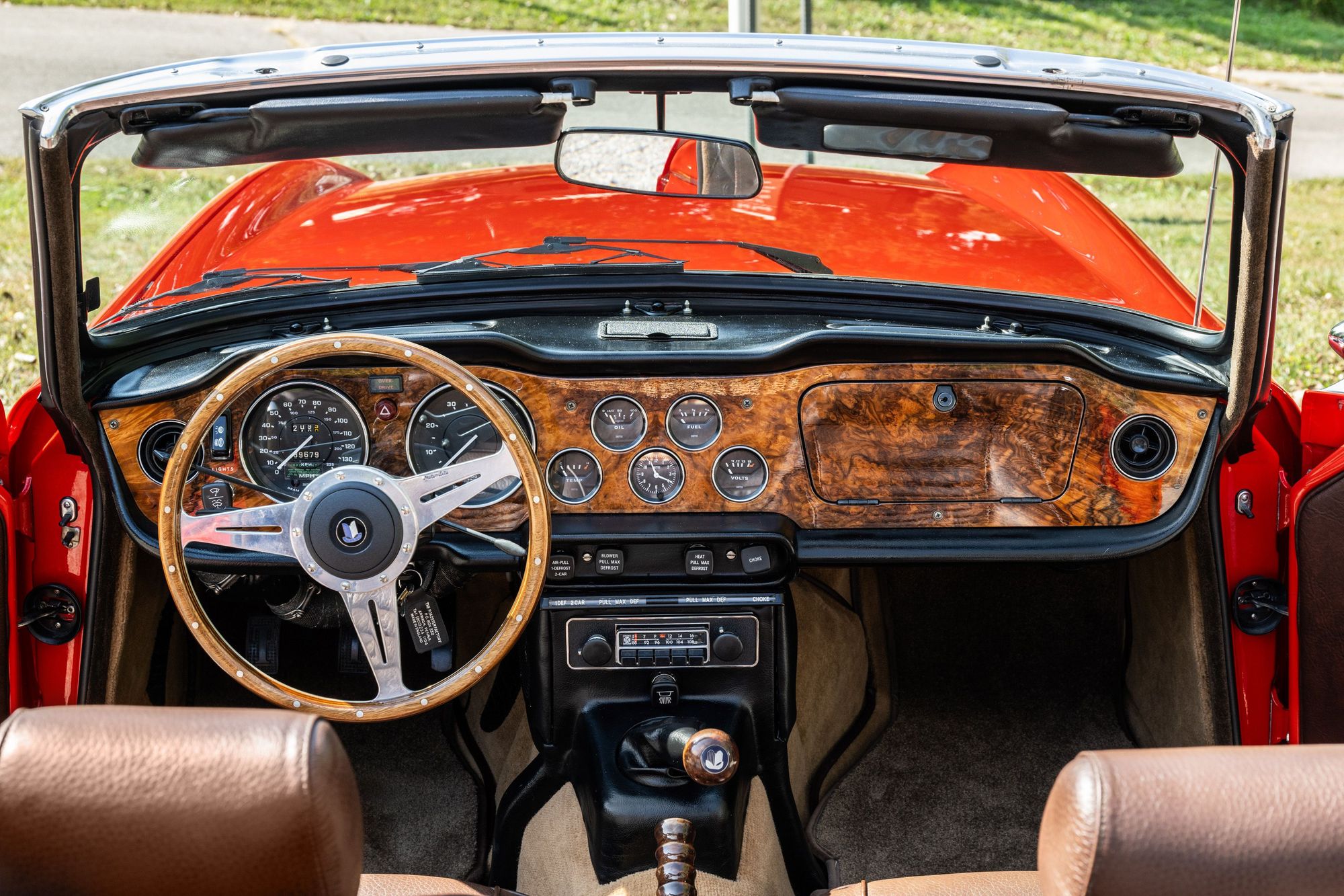 This was the interior of my 73 Triumph. People used to joke with me that it was a little Jaguar-ish with the leather seat covers, Burled walnut dash, door caps, and matching wood rimmed wheel!