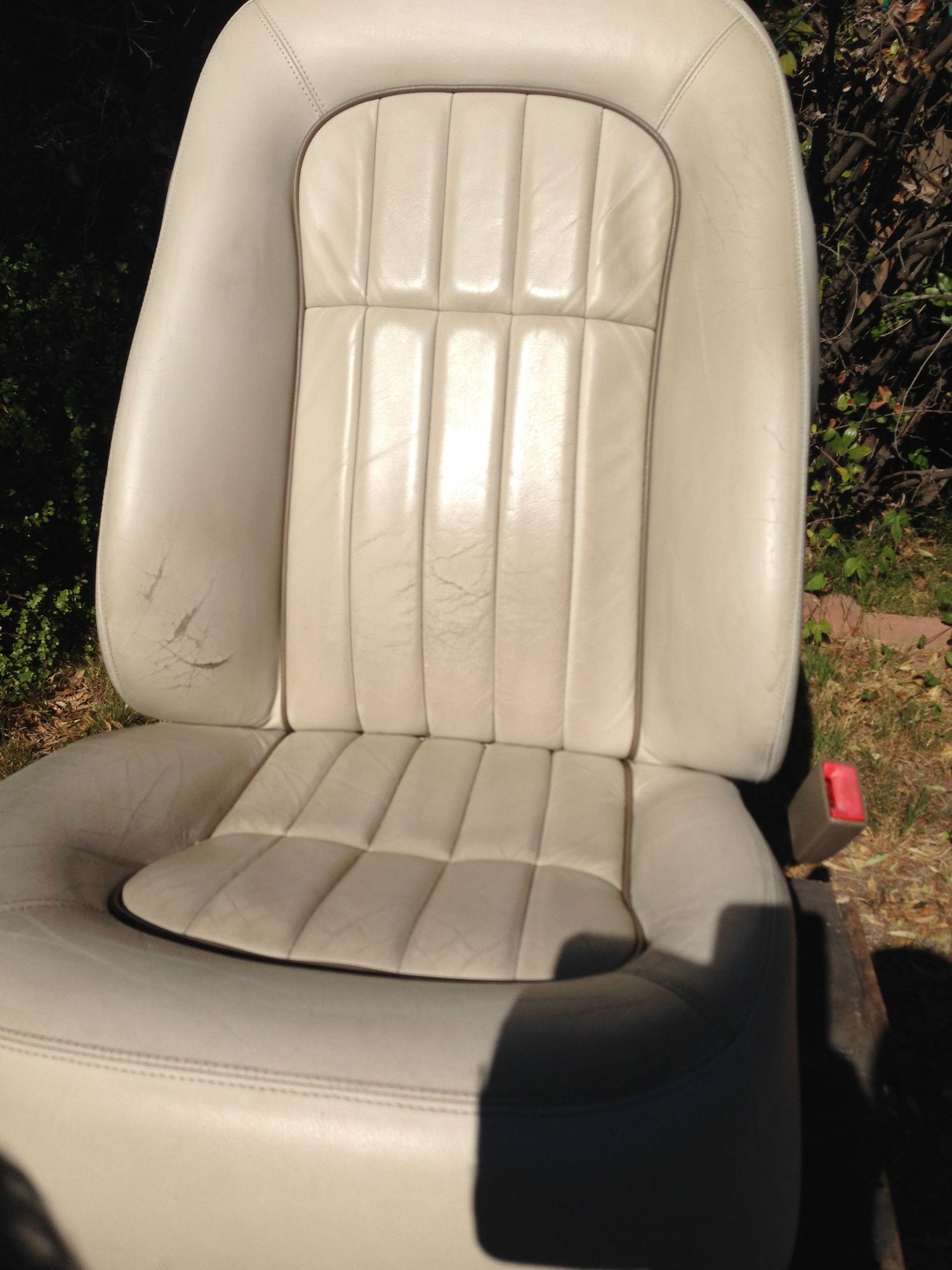 Passenger seat out of the car. showing hte wear along the side bolster.