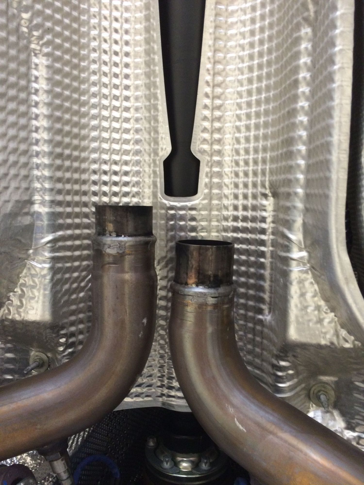 Stock front pipes outlet to center section. Notice the reduced pipe ends and a raised bead. Kind of a pain to work with, but we managed.
