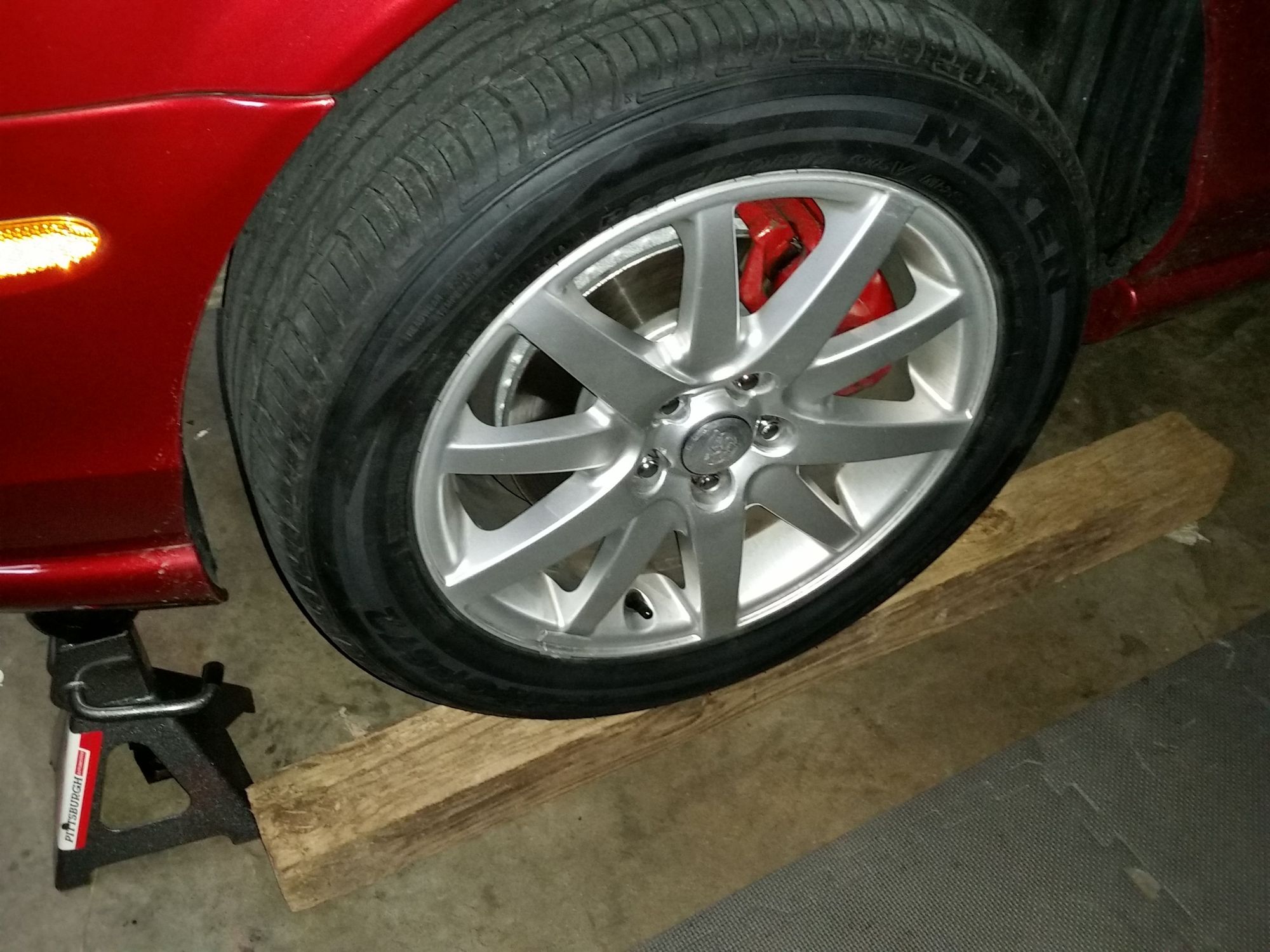 Opposite side of work area. Block this wheel with a 4x4 to prevent any movement of the steering system. Maintains your alignment