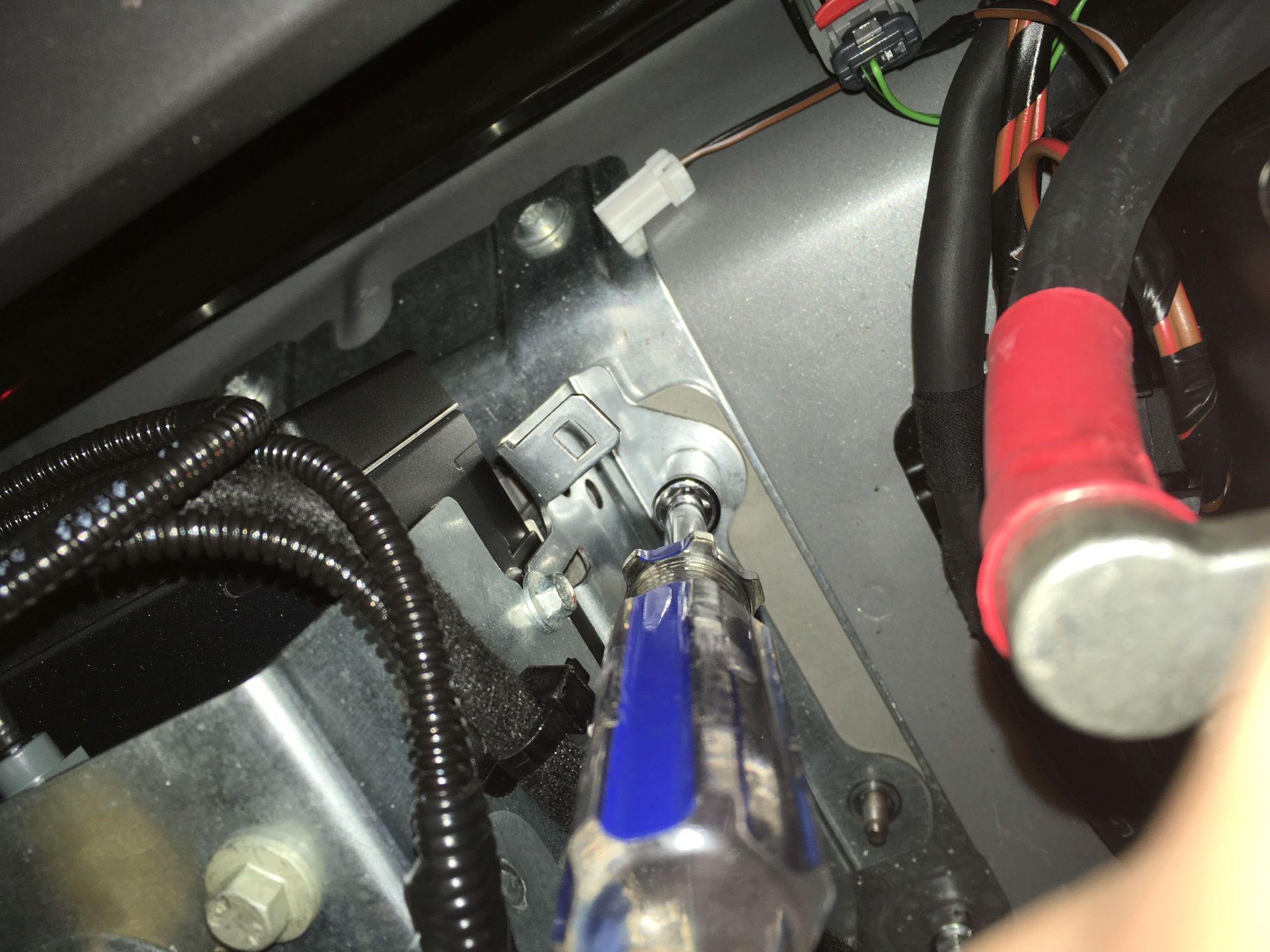 22. Then remove the nut closest to the battery terminal. BE CAREFUL.