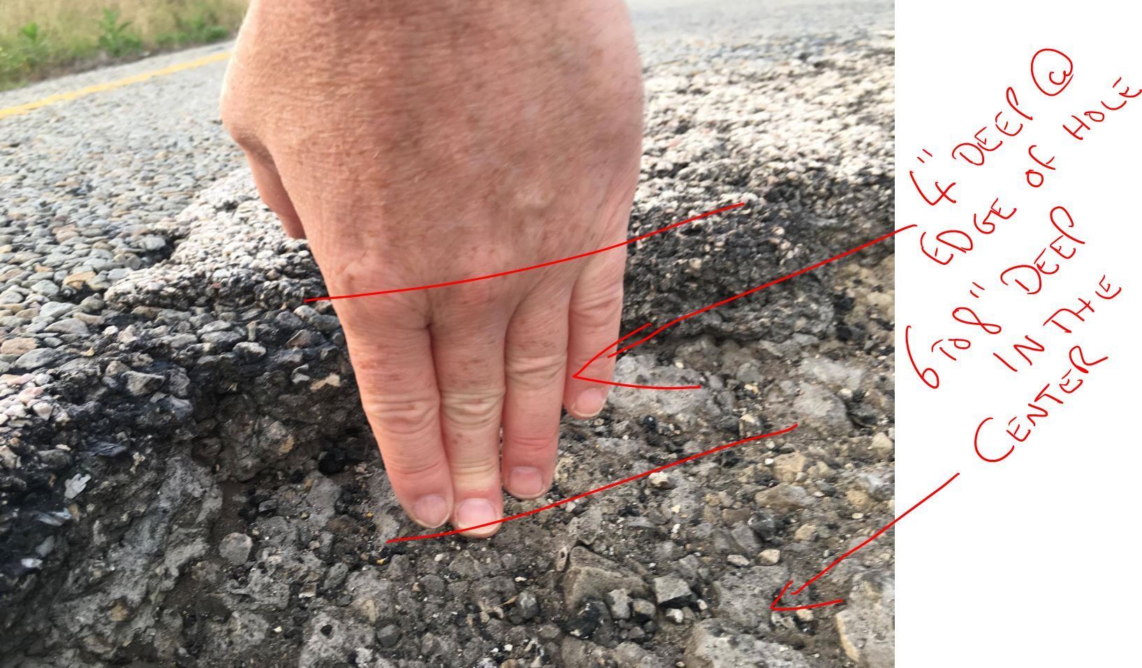my fingers on the edge of the second pot hole which shows 4" deep at the edge! it was around 6 to 8 inches deep in the middle.