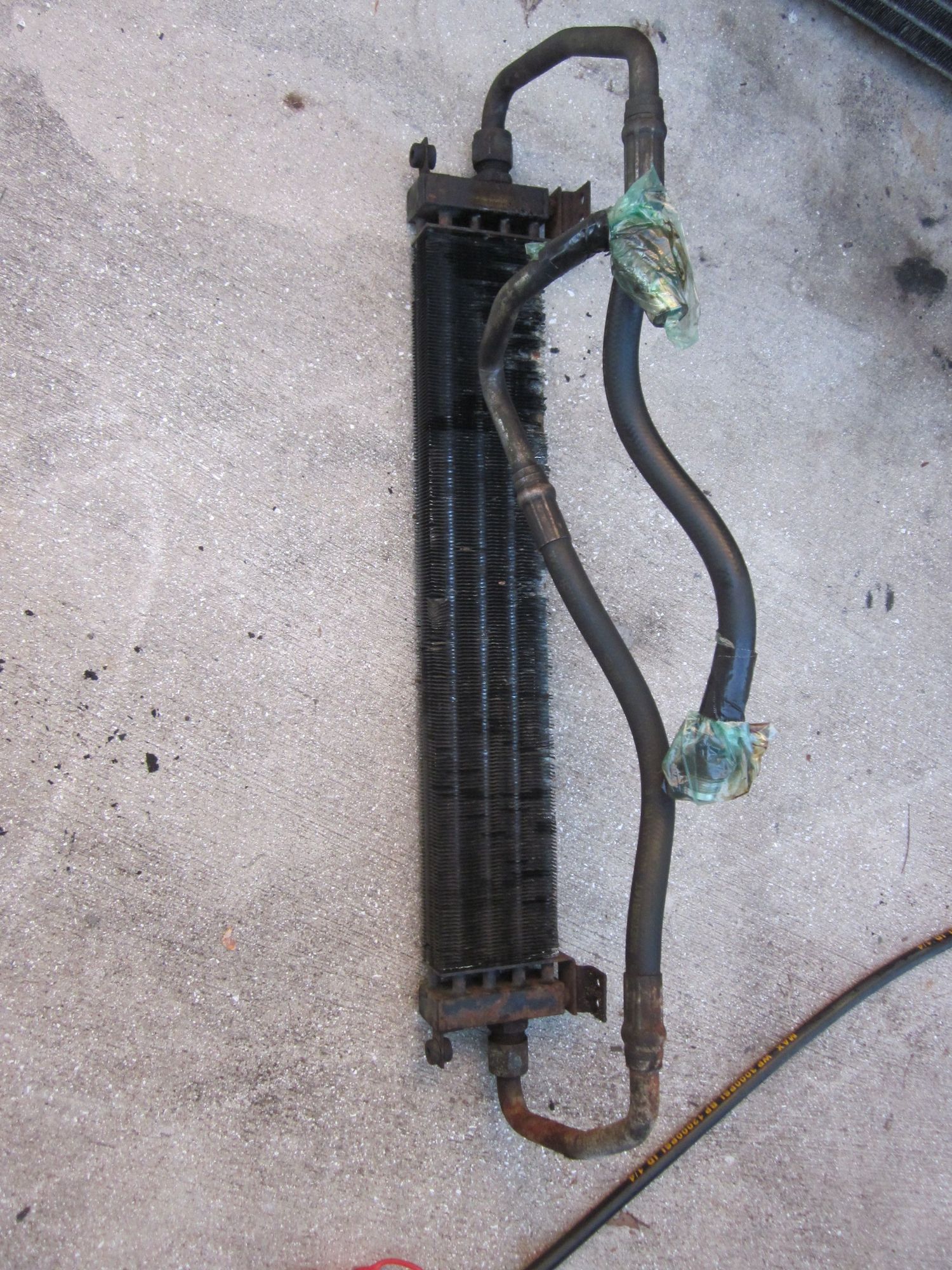 Engine Oil cooler, no leaks, 90% of the fins are in good shape, some are missing on lower right side. No damage to hoses or fittings